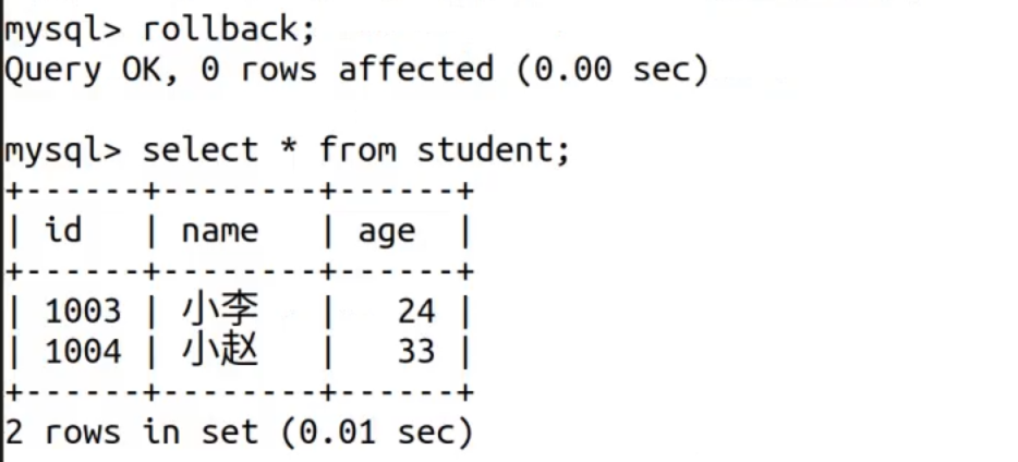 -- 回滚事务(所有操作取消,恢复到事务开始前状态)