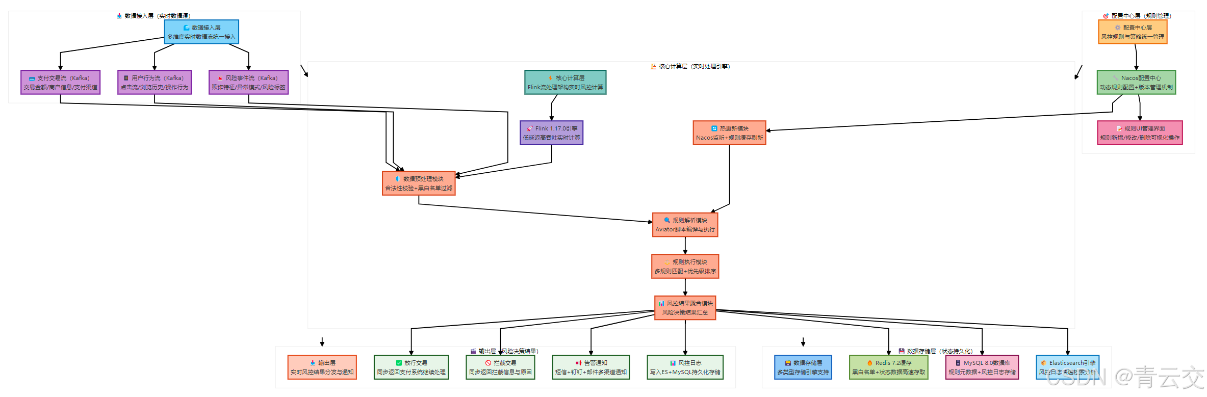 | 数据存储 | Redis 7.2、MySQL 8.0 | MongoDB、HBase | Redis 存储风控黑名单 / 白名单(毫秒级查询),MySQL 存储规则元数据 |