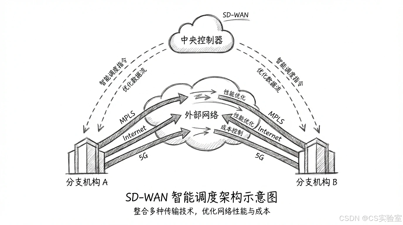 传统广域网配置复杂,且往往依赖昂贵的 MPLS 专线。SD-WAN 是 SDN(软件定义网络)技术在广域网的应用。
