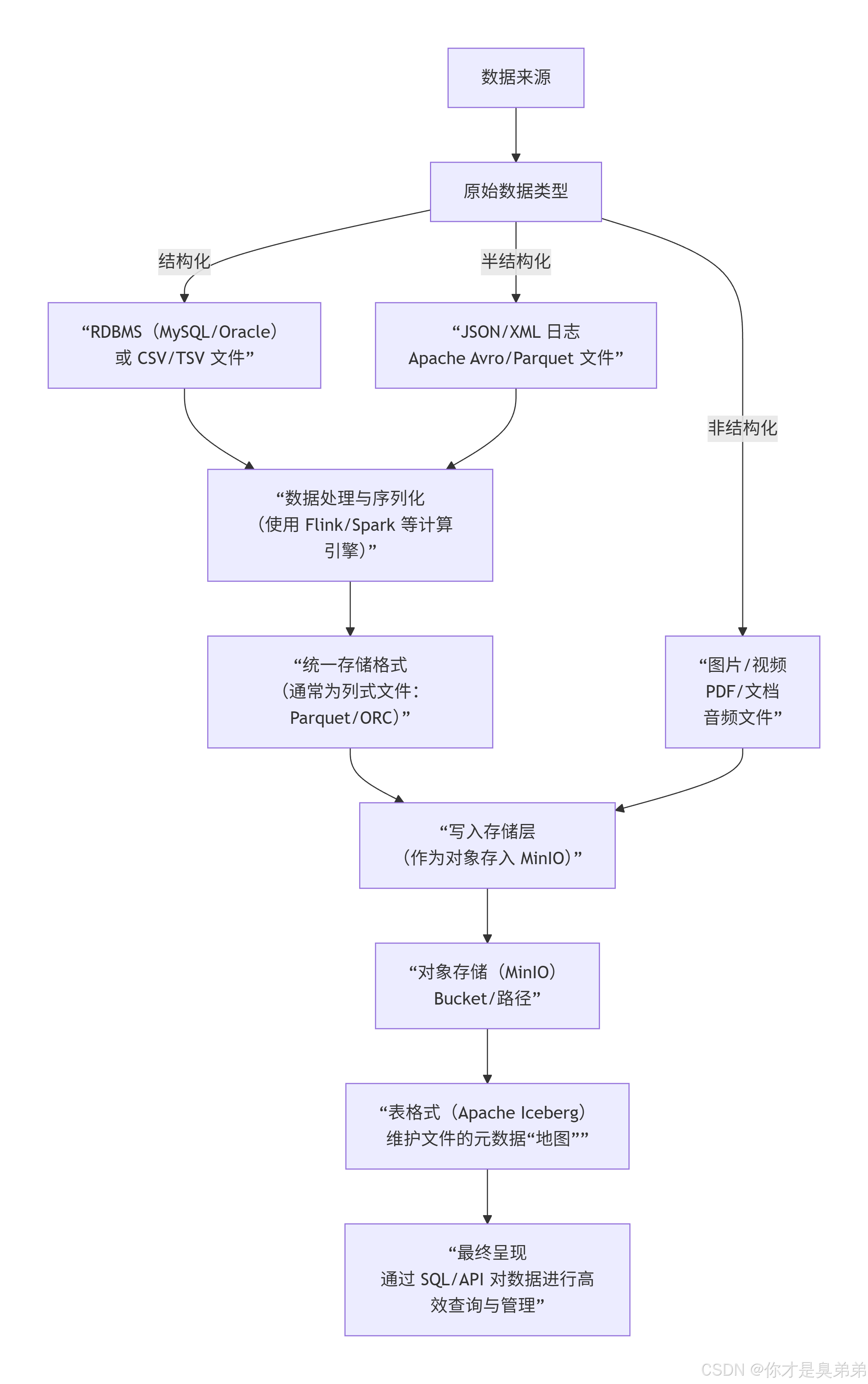 不同类型的数据如何通过数据湖架构,最终以文件形式存入MinIO: