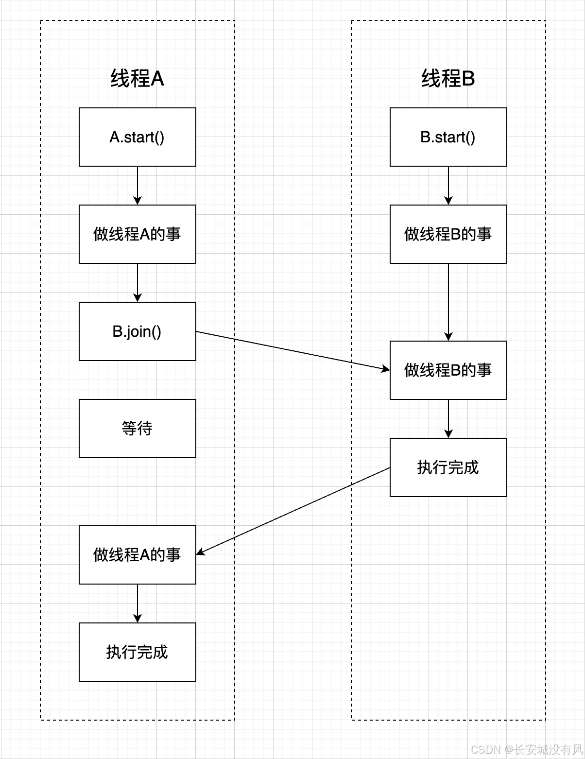 为了方便表达,大家也可以将 join() 操作理解为等待操作,如果在线程 A 的代码中出现了 线程 B 的 join() ,就可以理解为线程 A 要等线程 B 执行完才可以继续执行,等待线程 B 执行的过程中 线程 A 的状态是 WAITING 或者 WATING_TIME,也可以参照下图进行理解: