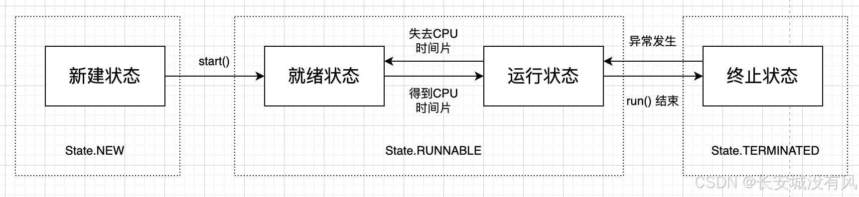 总之,NEW 状态的 Thread 实例调用了 start() 方法后,线程的状态将变成 RUNNABLE 状态。尽管如此,线程的 run() 方法不一定会马上被并发执行,需要在线程获取了 CPU 时间片之后,才会真正启动并发执行。