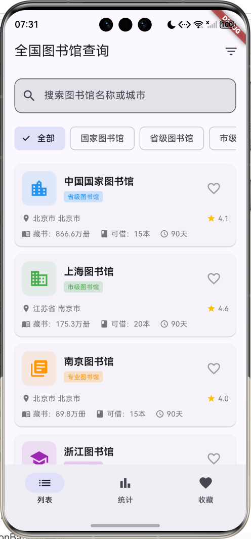 全国图书馆查询是一款专为阅读爱好者和学习者打造的Flutter应用,提供全国范围内图书馆信息查询、藏书量统计和借阅规则展示功能。通过智能搜索和多维度筛选,让用户轻松找到附近的图书馆,了解借阅政策,规划学习之旅。