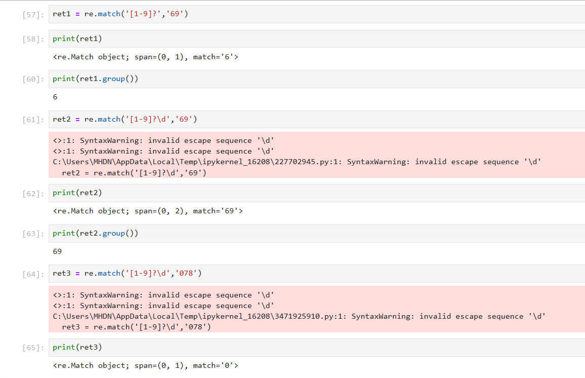 \] 匹配\[ \]中列举的字符 \\d 匹配数字,数字范围0\~9 \\D 匹配非数字,即匹配非数字的字符 \\s 匹配空白,即匹配空格,也就是tab键 \\S 匹配非空白 \\w 匹配单词字符,即匹配a\~z,A\~Z,0\~9,_ \\W 匹配非单词字符 *** ** * ** *** #### (1). 匹配任意一个字符(处理\\n)  #### (2)\[ \] 匹配\[ \]中列举的字符  #### (3)\\d 匹配数字,数字范围0\~9   (4)\\w 匹配单词字符,即匹配a\~z,A\~Z,0\~9,_  ## 三、匹配多个字符 \* 匹配前一个字符出现0次或者无数次,即可有可无 + 匹配前一个字符出现1次或者无数次,即至少有1次 ? 匹配前一个字符出现1次或者0次,即要么有1次要么没有 {m} 匹配前一个字符出现m次 {m,n} 匹配前一个字符出现从m次到n次 *** ** * ** *** #### (1)\* 匹配出,一个字符串第一个字母为大小字符,后面都是小写字母并且这些小写字母可有可无。 `re.match()`:**从字符串开头开始匹配**,会尽可能多地匹配符合规则的字符(贪心匹配),直到无法匹配为止。  #### (2)+:匹配出,变量名是否有效 (从字符串**开头** 开始,先匹配**至少 1 个** "空格 / 字母 / 下划线",紧接着匹配**任意个** "字母 / 数字 / 下划线",直到遇到不符合的字符为止(`re.match` 是贪心匹配))  #### (3)? 匹配数字 匹配前一个字符出现1次或者0次,即要么有1次,要么没有 **从字符串开头开始,匹配 "可选的 1-9 数字" + "必选的 0-9 数字",总共匹配 1 位或 2 位数字** (`[1-9]?` 是 0/1 次,`[0-9]` 是 1 次,合计 1 或 2 位)。  接下来再举几个例子:  ok,默写完毕,我只记得这些,继续做题去了。