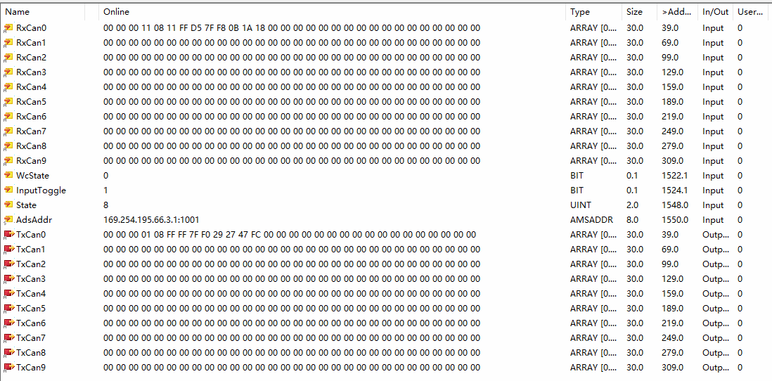 观察 TwinCAT 界面,可以观察到接收和发送的 CAN 帧信息: