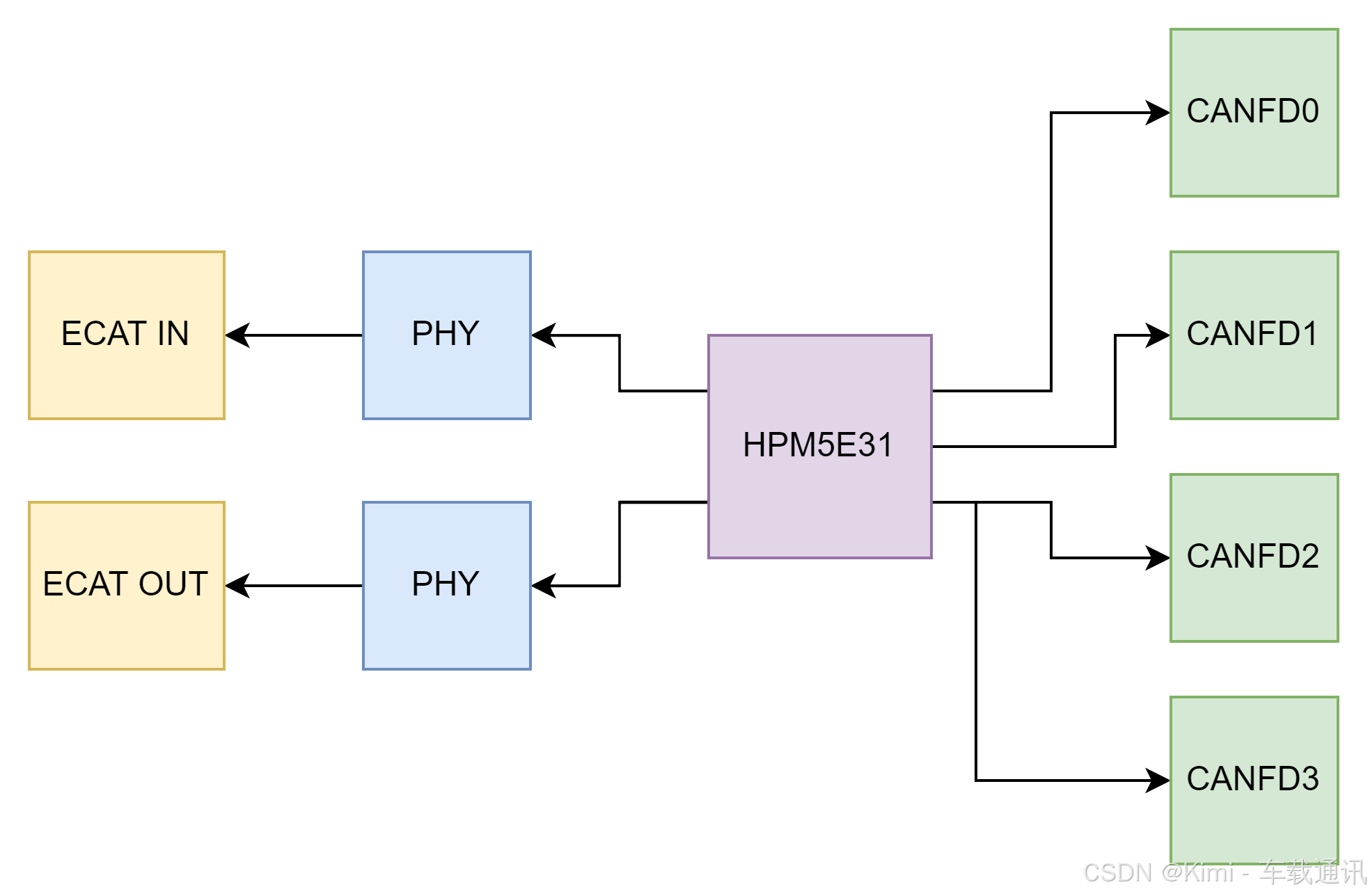 KH-EtherCAT-CANFDX4-OP 是一款开源硬件模块,模块基于 HPMicro HPM5E31 微控制器开发,实现 EtherCAT 与四通道 CAN FD 总线之间的实时双向数据转发。