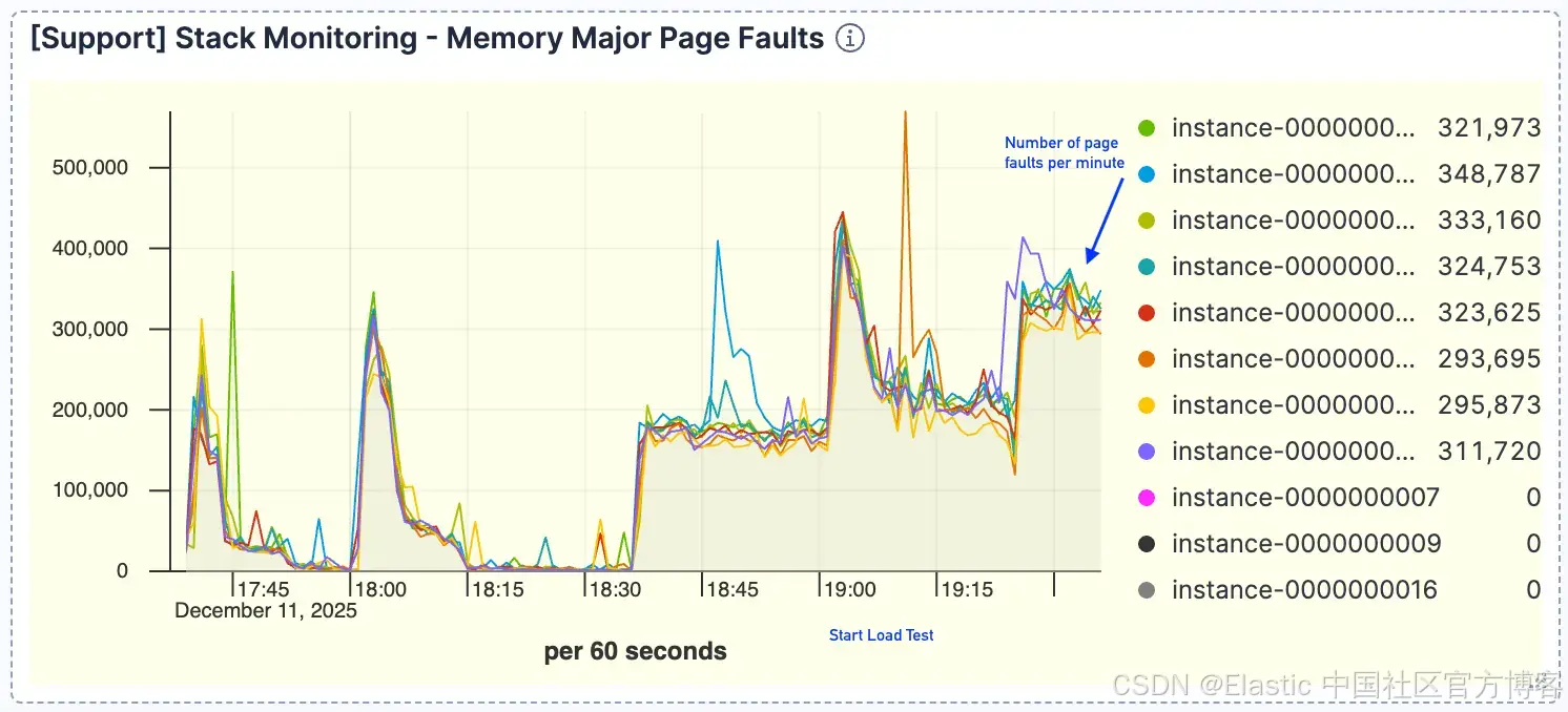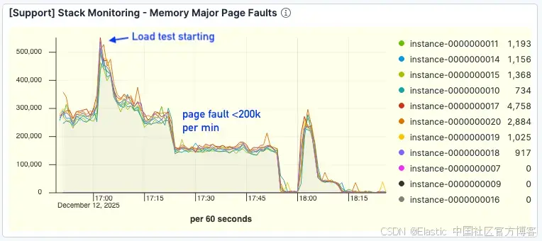 关键是,page faults 显著下降。即使在更高的吞吐量下,faults 也维持在每分钟 <200k 左右,而基准测试中则超过 300k。