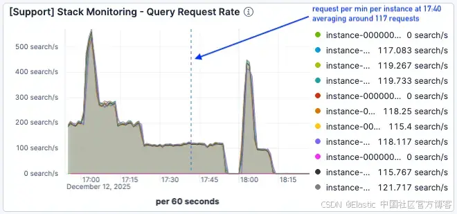 在下一次负载测试中(从 17:00 开始),流量更高,每个 Elasticsearch 节点的峰值达到每分钟 500 个请求。