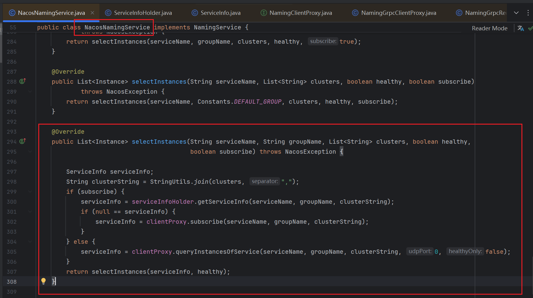 之前有提到,Nacos2.X版本中就是通过实现Spring Cloud服务发现接口,依赖于NacosServiceDiscovery来和Nacos服务端进行交互,在NacosServiceDiscovery中查询服务列表的操作其实就是调用的namingService().selectInstances(),我们可以进去看看他的逻辑