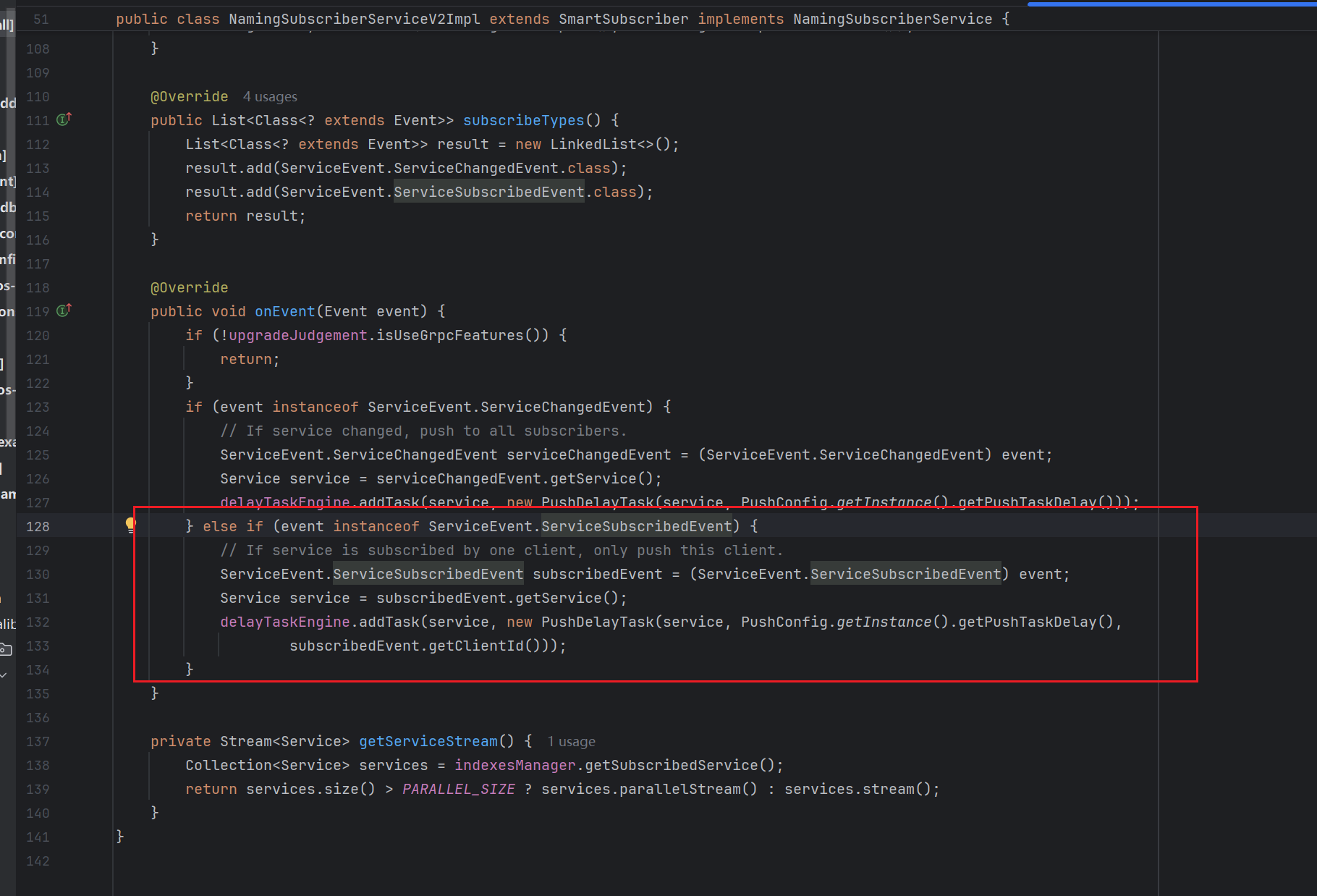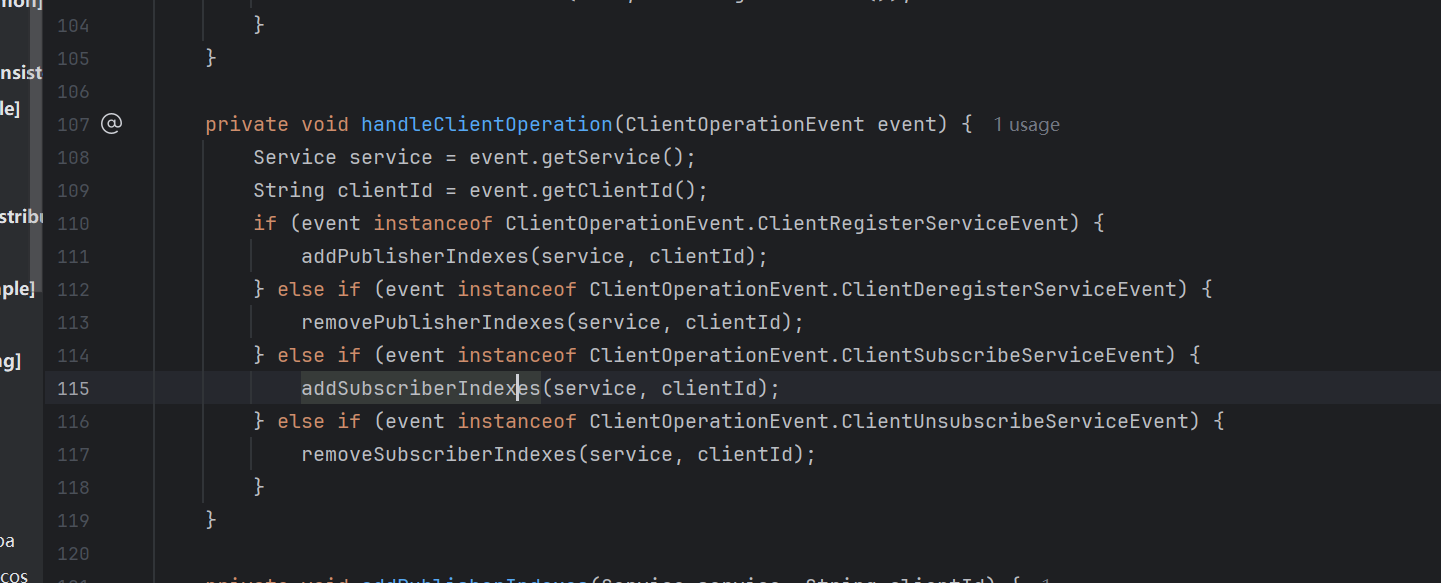 在上述逻辑的最后呢,发布了ClientSubscribeServiceEvent这个事件,我们来分析一下这个地方,同样的,通过Idea的全局搜索,我们可以找到处理这个事件的地方,其实也是我们一开始进行RPC注册时候处理注册事件的地方,我们先来稍微的看一下