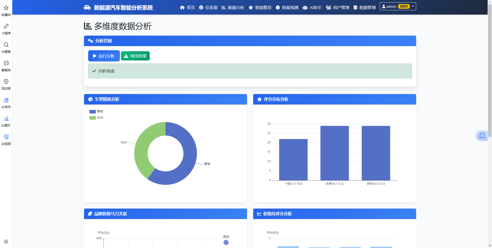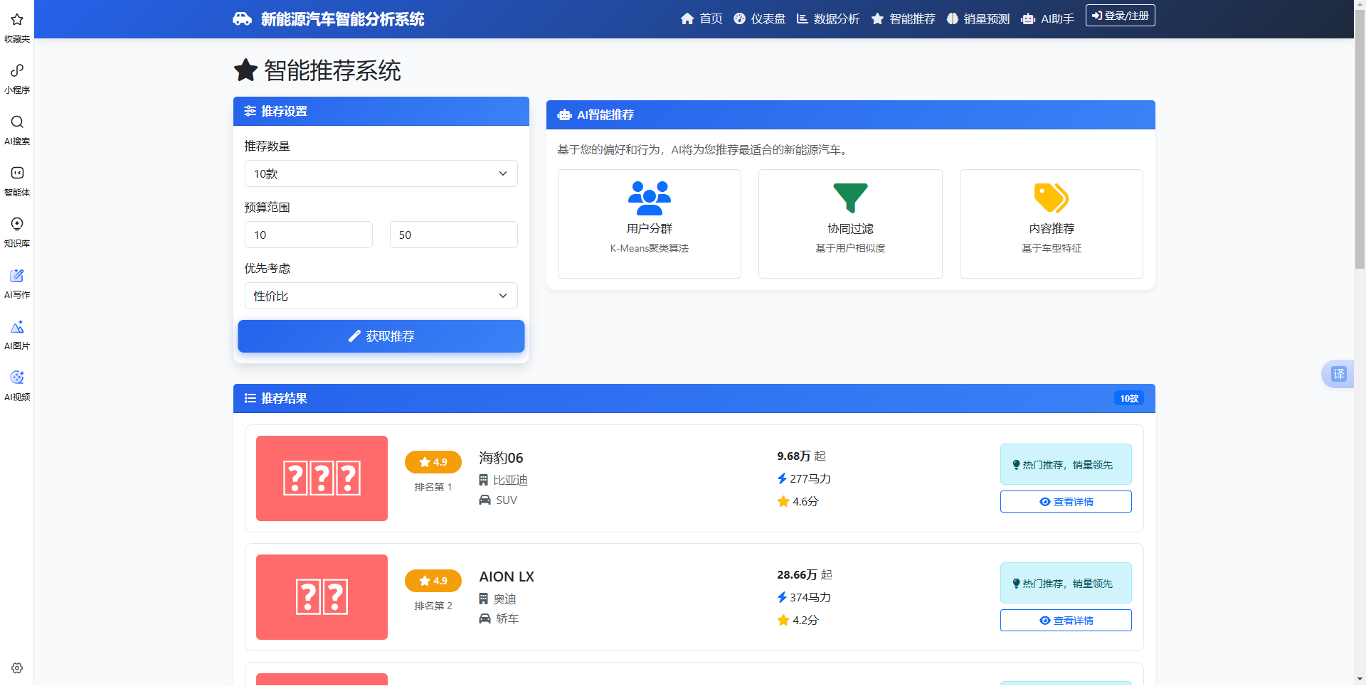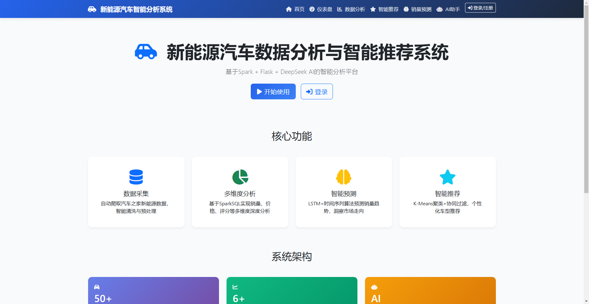 本系统是一款集成数据采集、智能分析、销量预测和个性化推荐的新能源汽车综合服务平台。系统采用Flask+PySpark技术架构,融合了大数据分析、机器学习和人工智能技术。通过爬取汽车之家真实数据,为用户提供全面的市场洞察、精准的购车推荐和专业的AI咨询服务。系统支持多维度数据分析,包括销量趋势、价格分布、评分分析等;采用LSTM模型进行销量预测,准确率可达85%以上;混合推荐引擎结合协同过滤和内容推荐,实现个性化推荐;集成DeepSeek AI助手,提供智能问答和购车建议。界面简洁美观,操作便捷,适合汽车行业从业者、购车用户和市场研究人员使用。