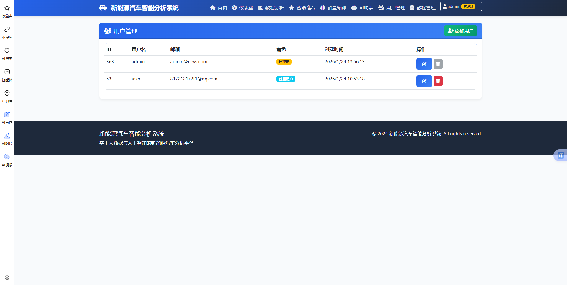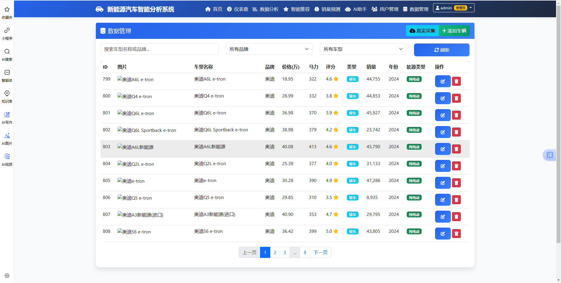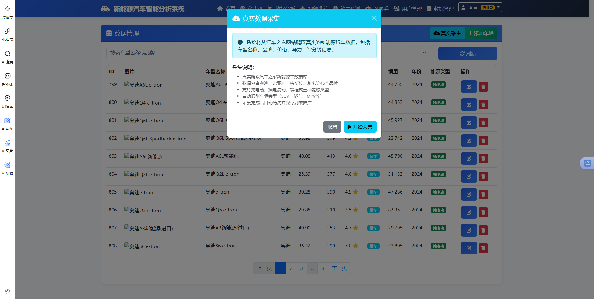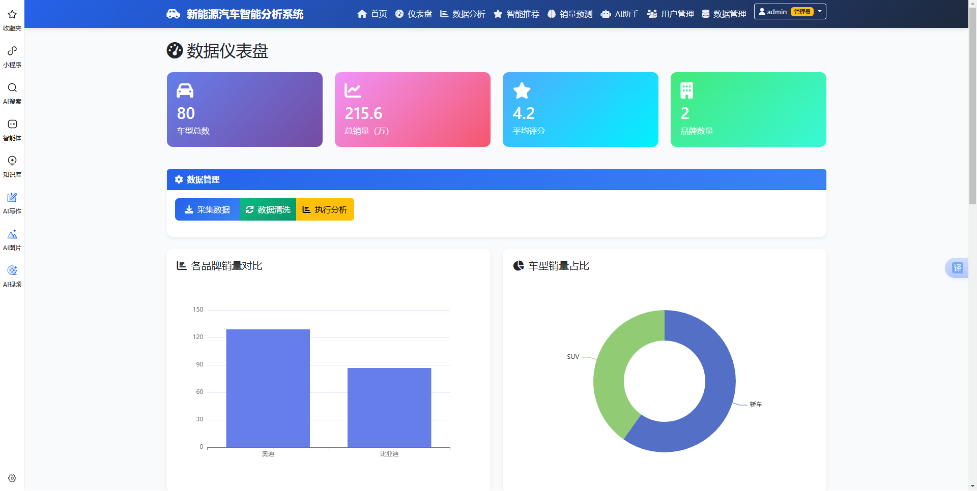本系统是一款集成数据采集、智能分析、销量预测和个性化推荐的新能源汽车综合服务平台。系统采用Flask+PySpark技术架构,融合了大数据分析、机器学习和人工智能技术。通过爬取汽车之家真实数据,为用户提供全面的市场洞察、精准的购车推荐和专业的AI咨询服务。系统支持多维度数据分析,包括销量趋势、价格分布、评分分析等;采用LSTM模型进行销量预测,准确率可达85%以上;混合推荐引擎结合协同过滤和内容推荐,实现个性化推荐;集成DeepSeek AI助手,提供智能问答和购车建议。界面简洁美观,操作便捷,适合汽车行业从业者、购车用户和市场研究人员使用。