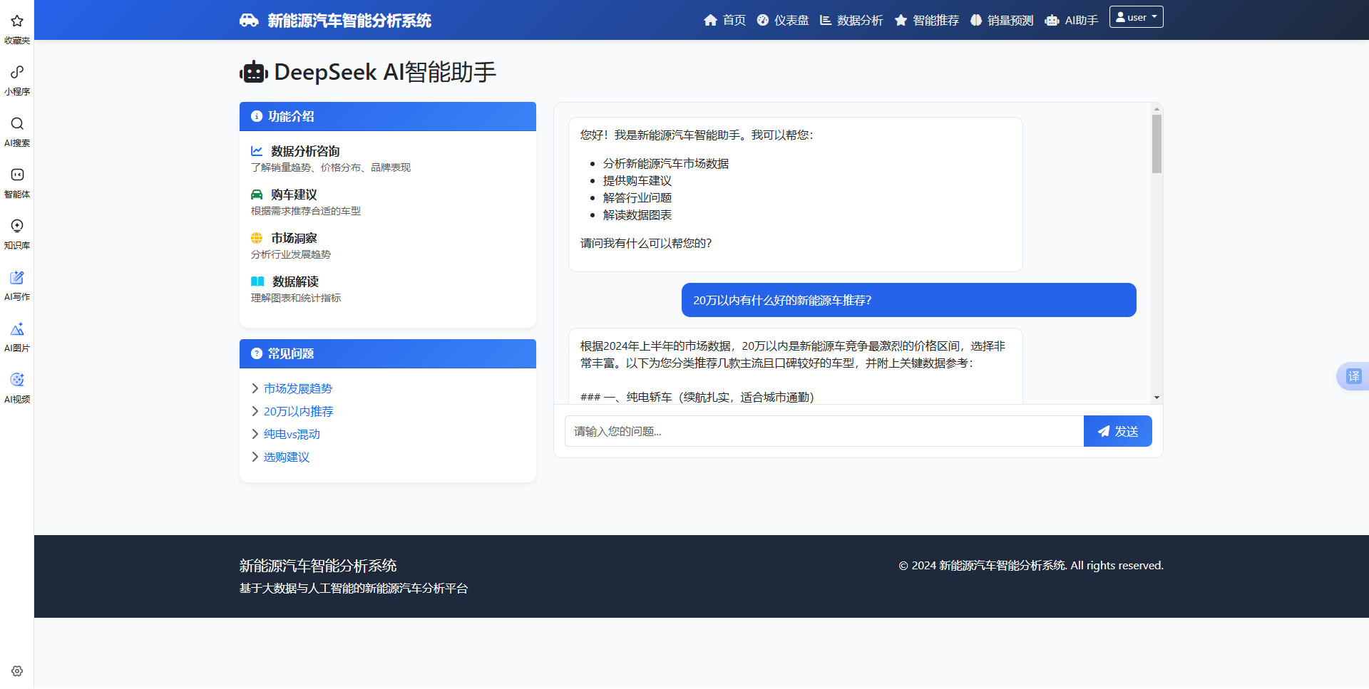 系统集成了DeepSeek大语言模型,提供7×24小时的智能咨询服务。用户可以通过自然语言提问,AI助手会基于系统中的数据和分析结果,给出专业、准确、个性化的回答。咨询内容包括数据分析解读、购车建议、市场洞察、车型对比等。AI助手具备深度理解能力,能够分析复杂的查询需求,结合用户的具体情况提供定制化建议。同时,AI助手还支持多轮对话,可以通过追问不断细化需求,最终提供最优解决方案,大大提升用户体验和决策效率。