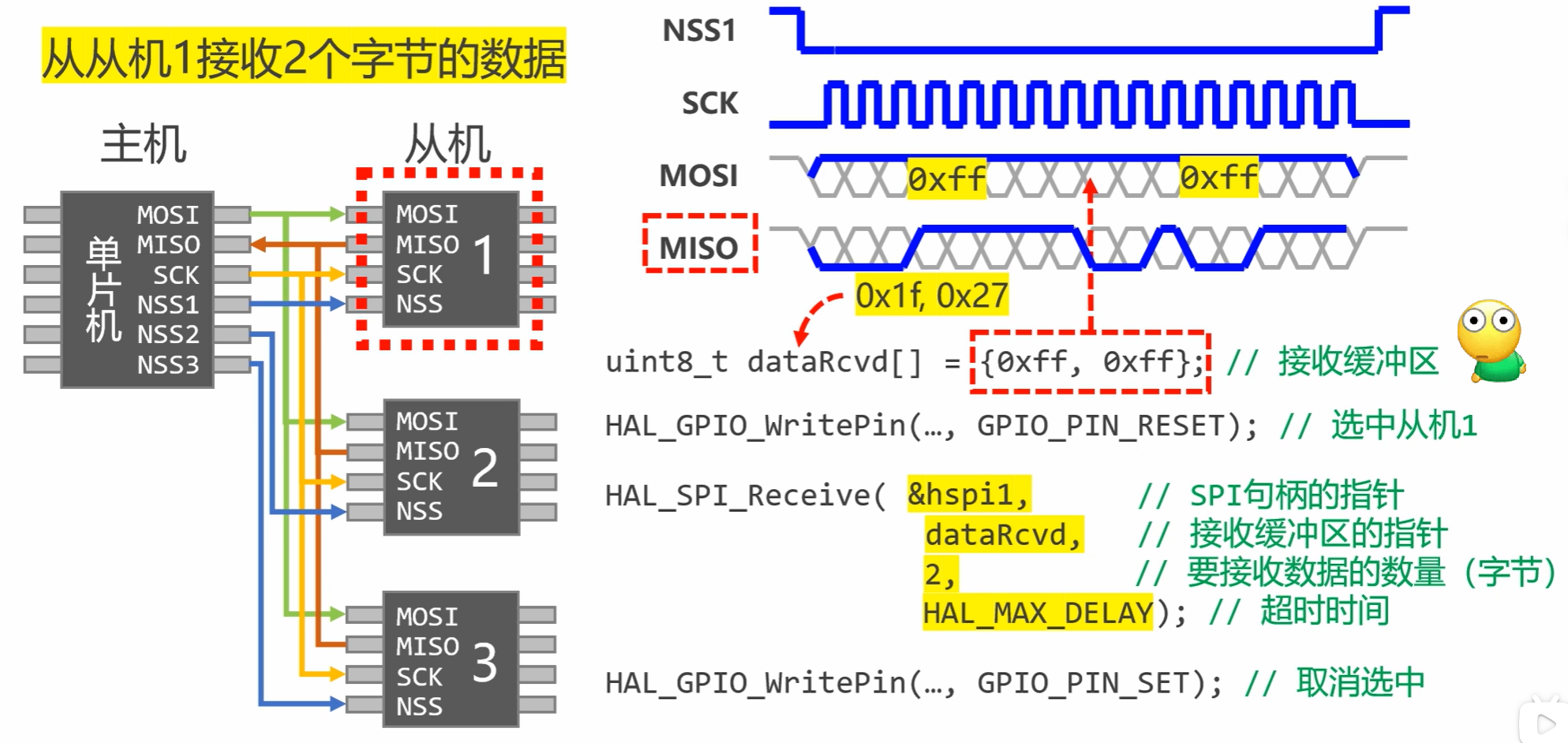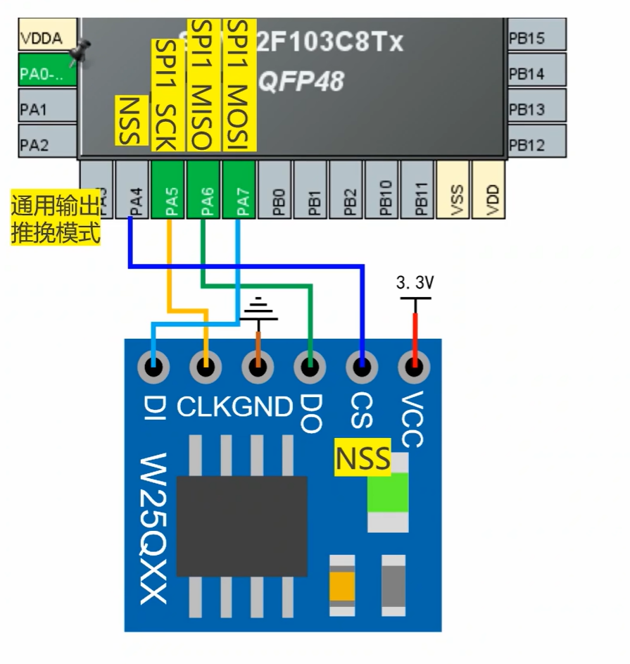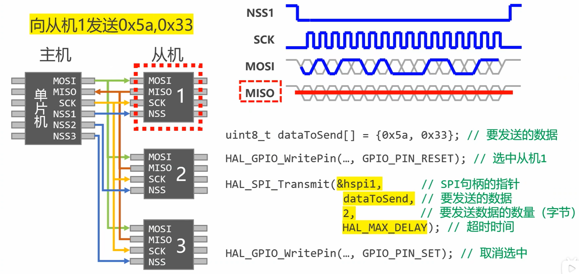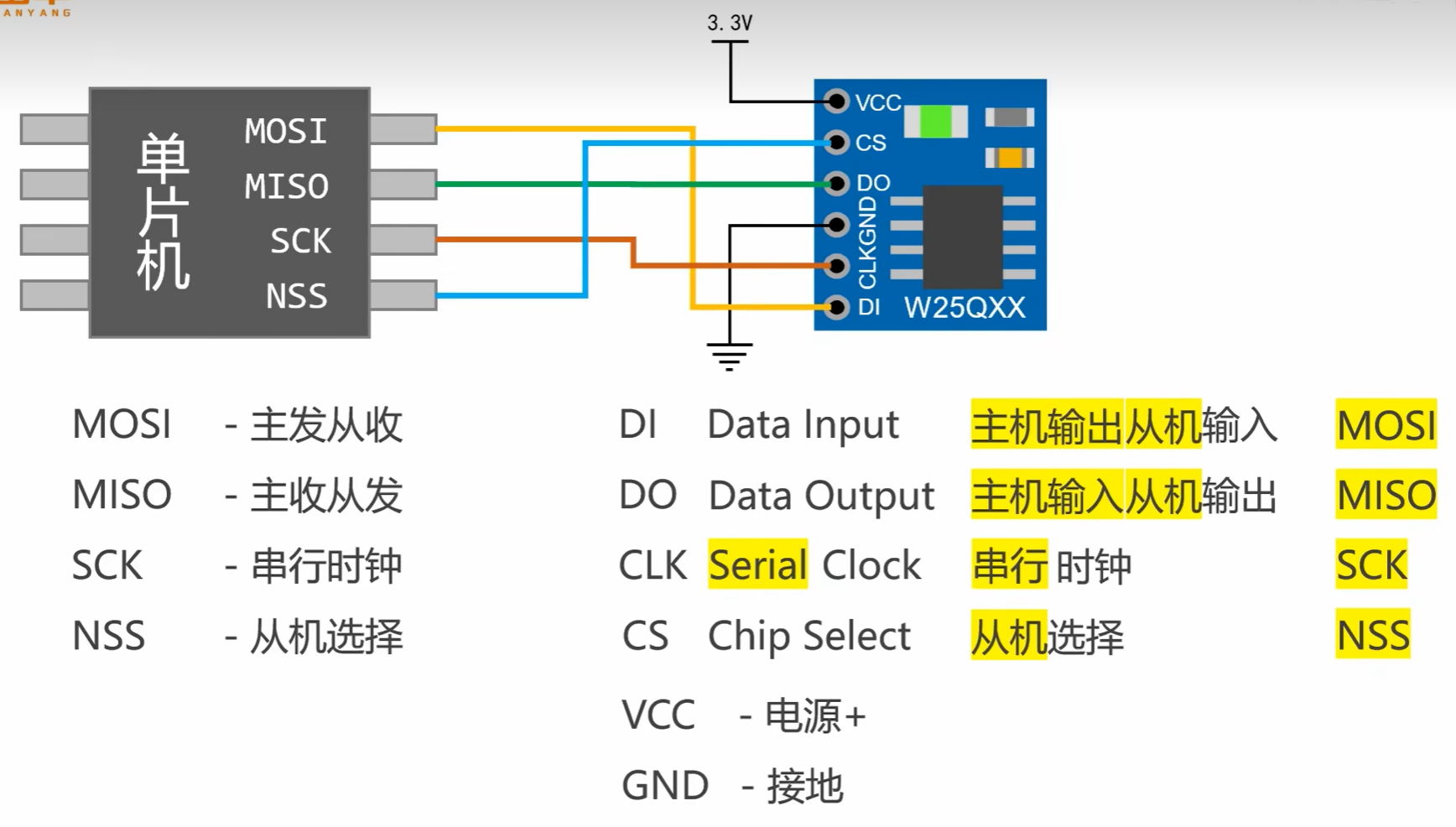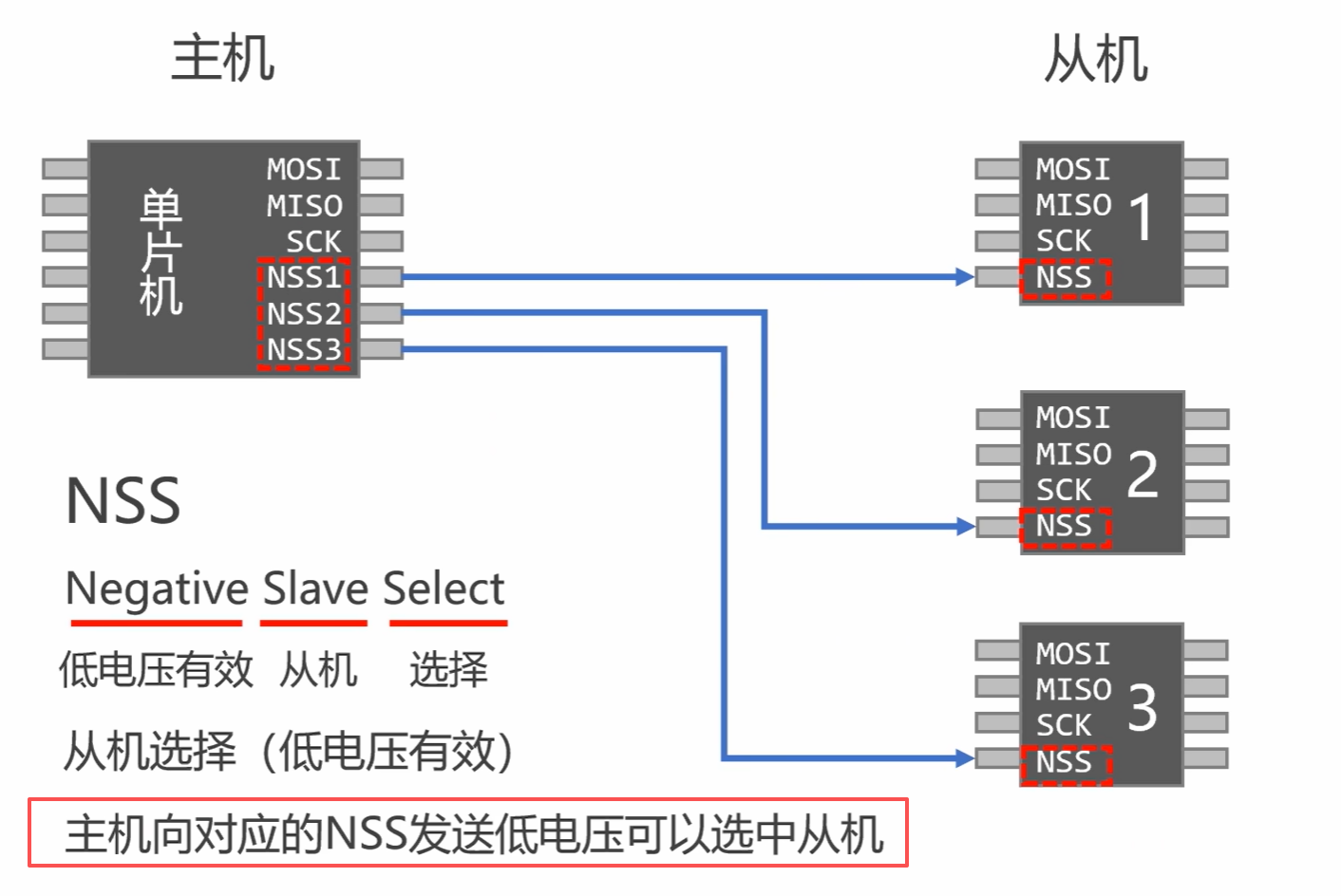 - 主从架构:1 个主设备(如 MCU)+ 多个从设备(如传感器、存储芯片),主设备控制时钟与通信时序。
