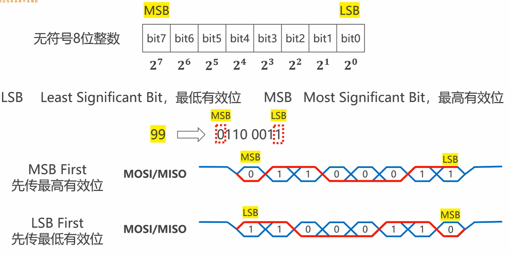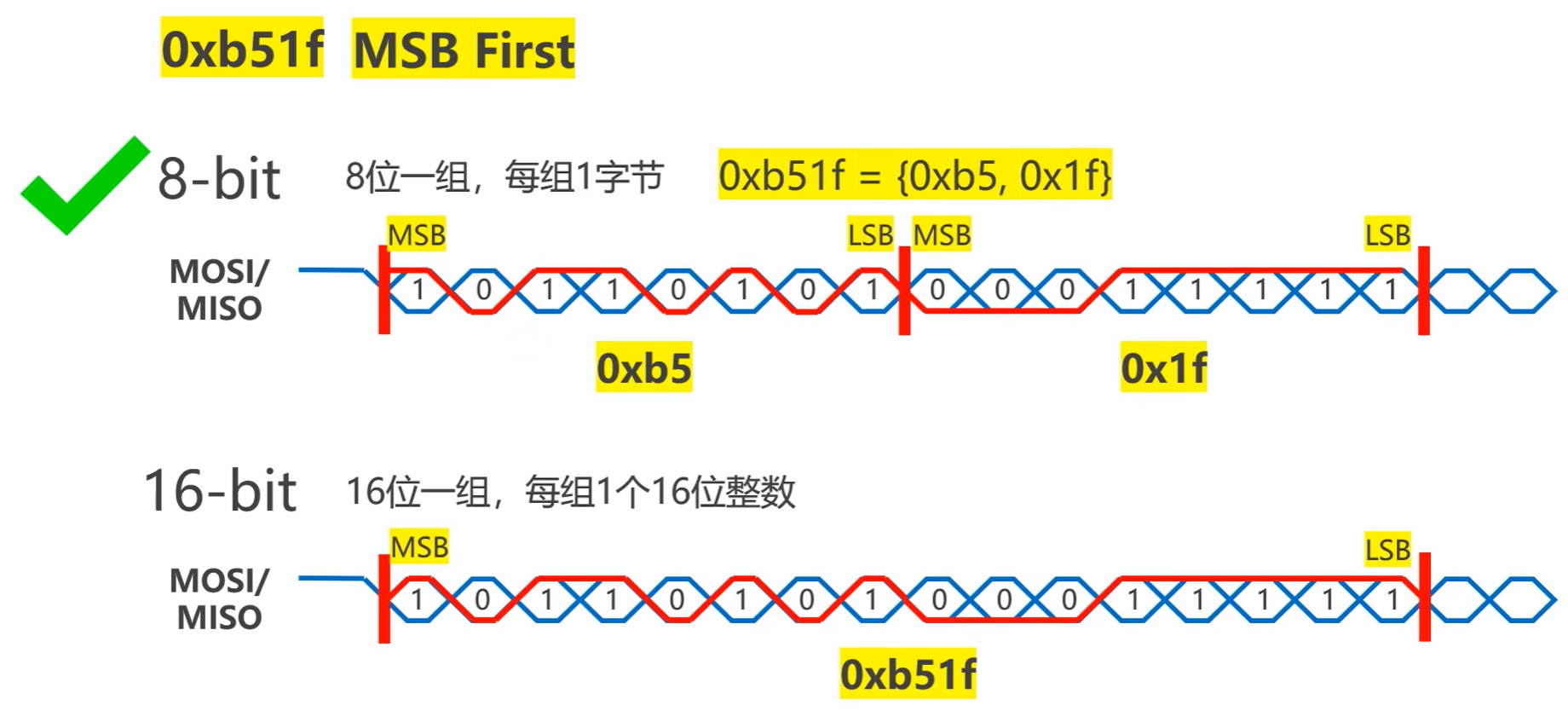 MSB First :最高位优先传输(SPI 默认模式,如 0x12 先传 0001,再传 0010)。