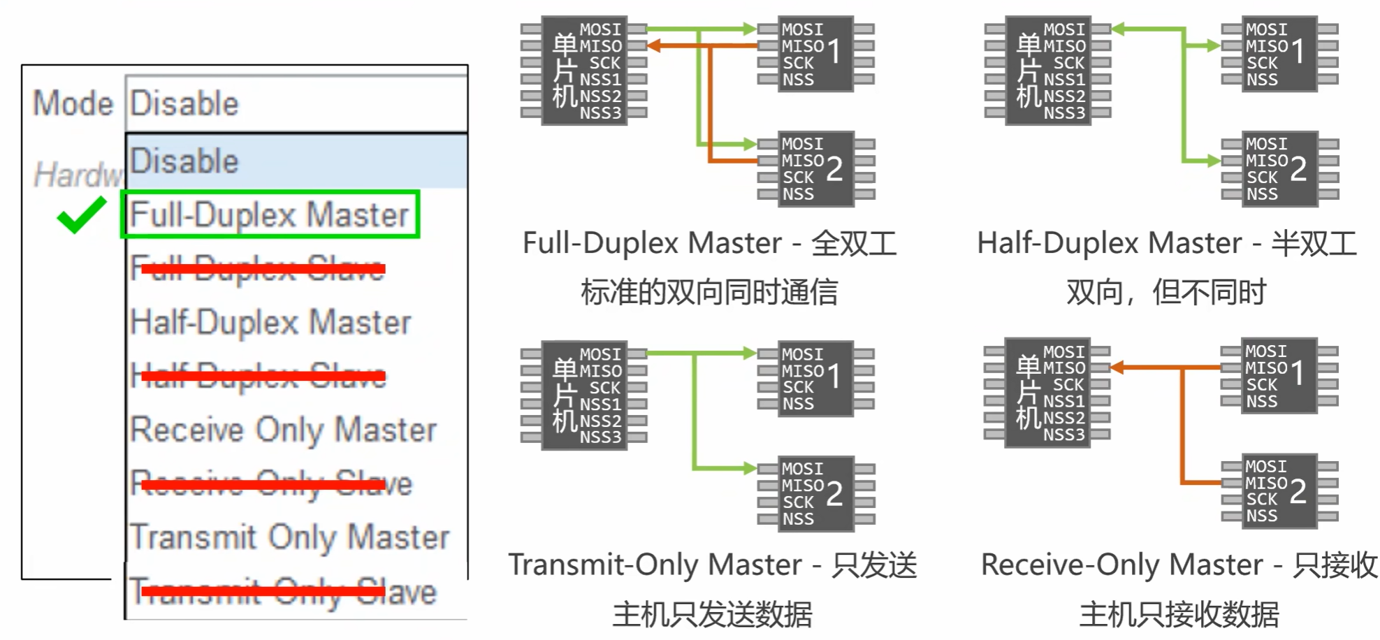 SPI模式,大部分情况选第一种模式,也就是全双工。