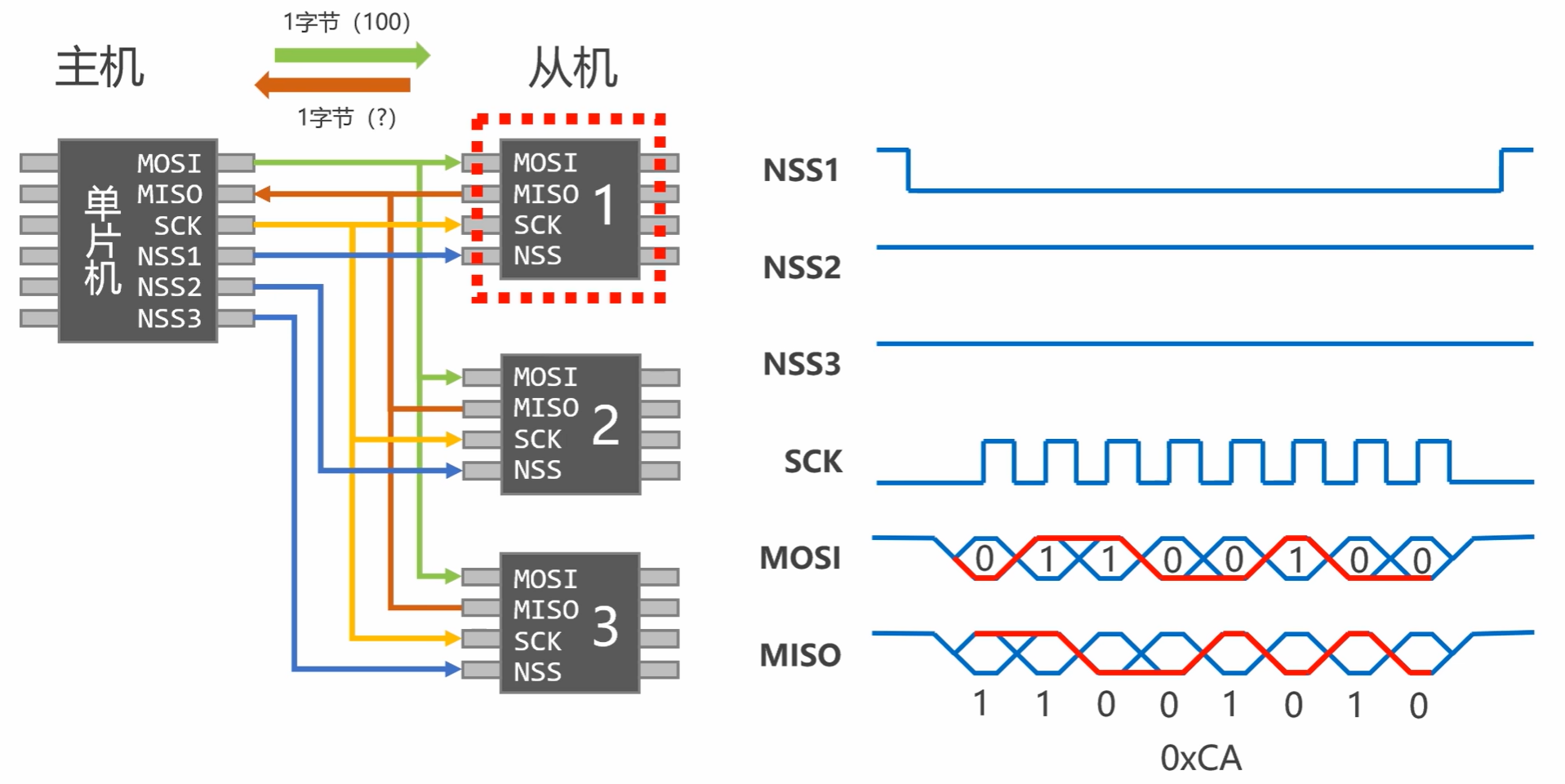 - CS/SS:片选信号(主设备输出,选中对应从设备)