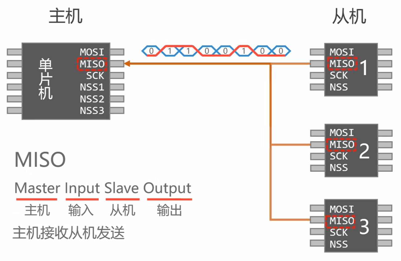 - MISO:主收从发(Master In Slave Out)