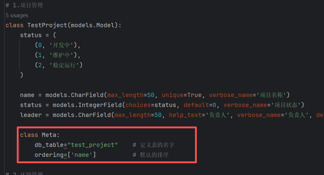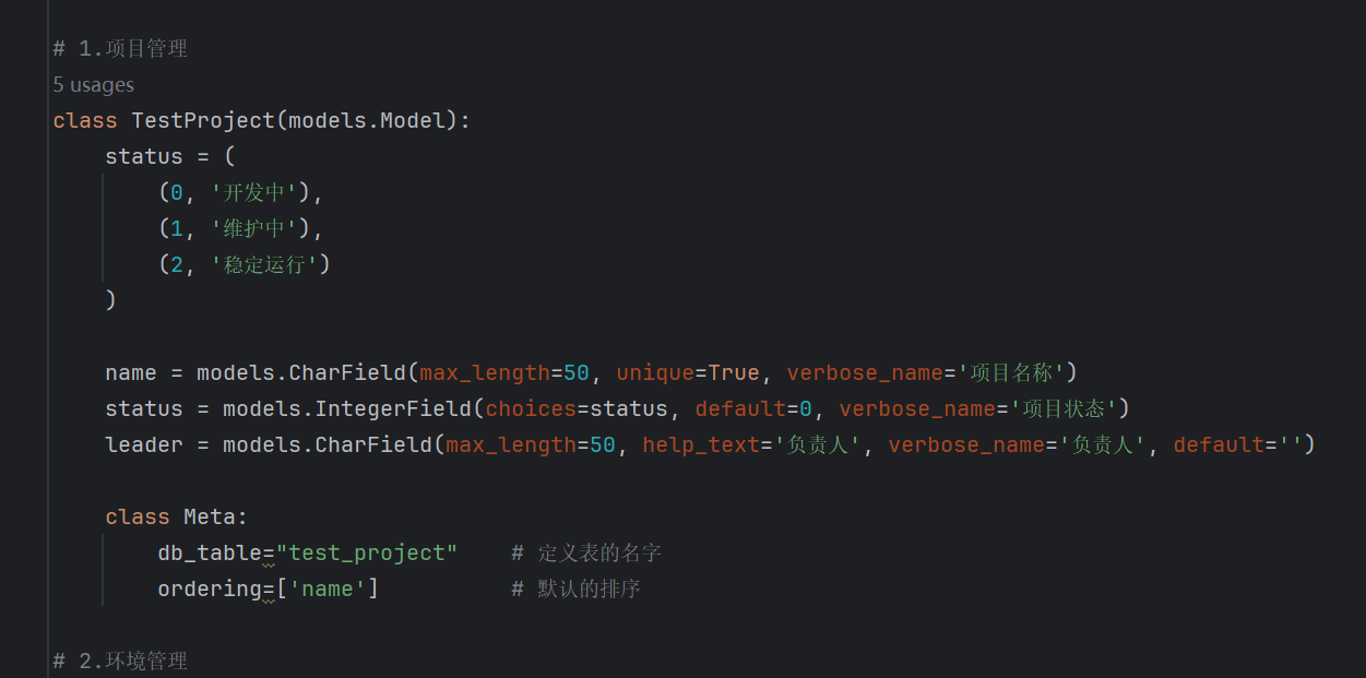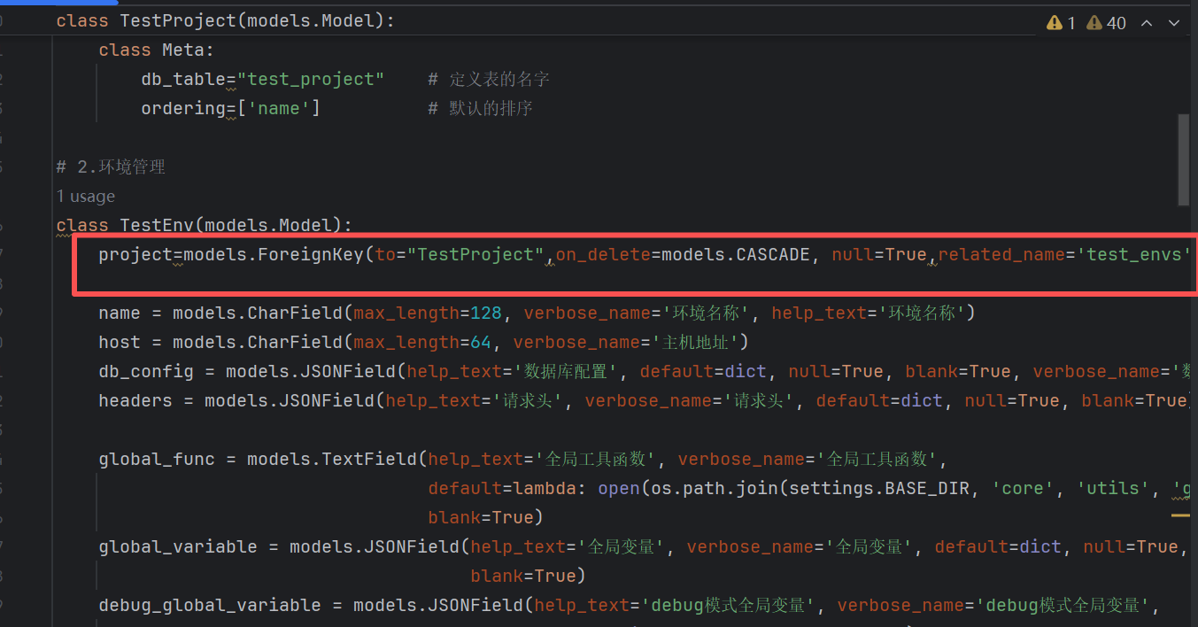 以项目和环境为例,因为一个项目对应多个运行环境,所以,我们需要把关联关系定义在环境里面