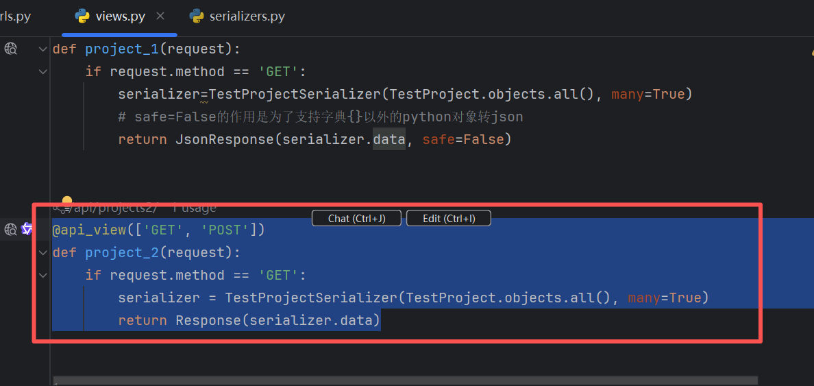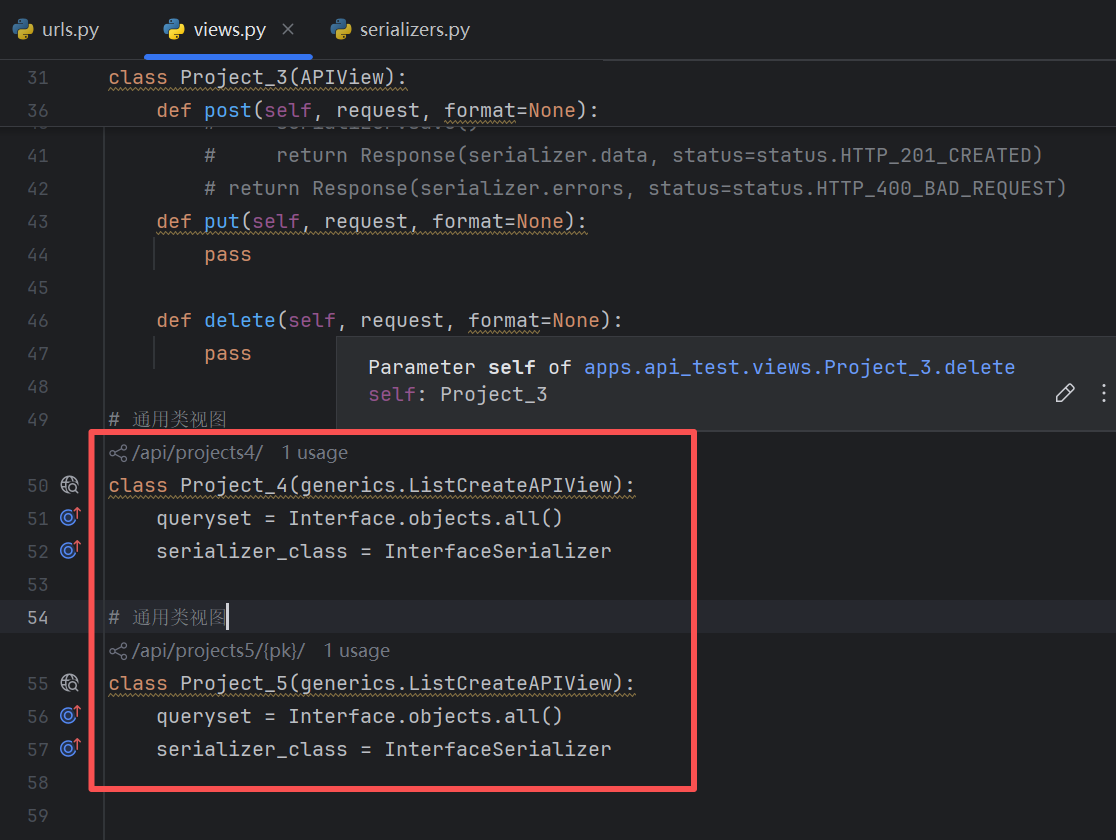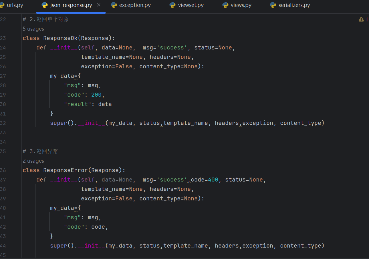 为了解决视图集的数据返回格式问题,我们可以对视图集的五个API函数进行重写(当然,这不是唯一的解决办法),每个函数中仅需要替换Response返回类为我们上面自己封装的三个ResponseXXX类。