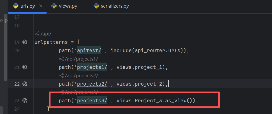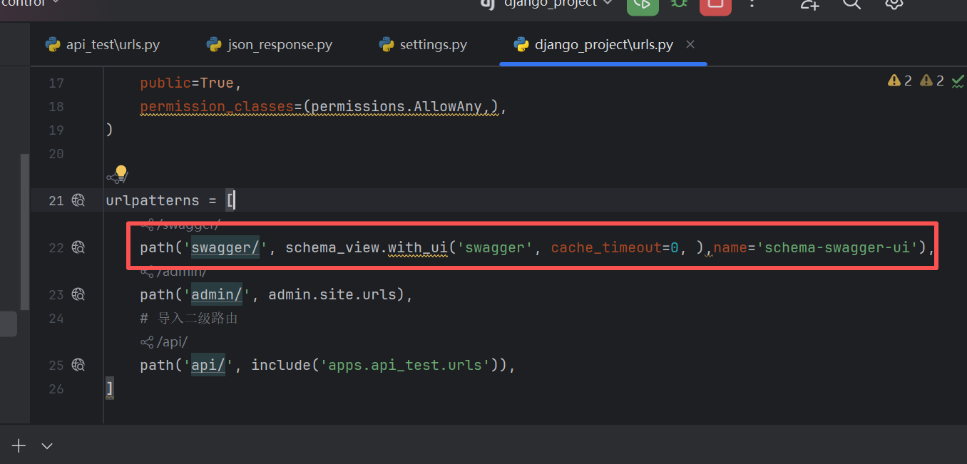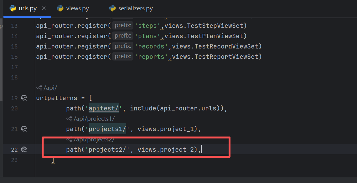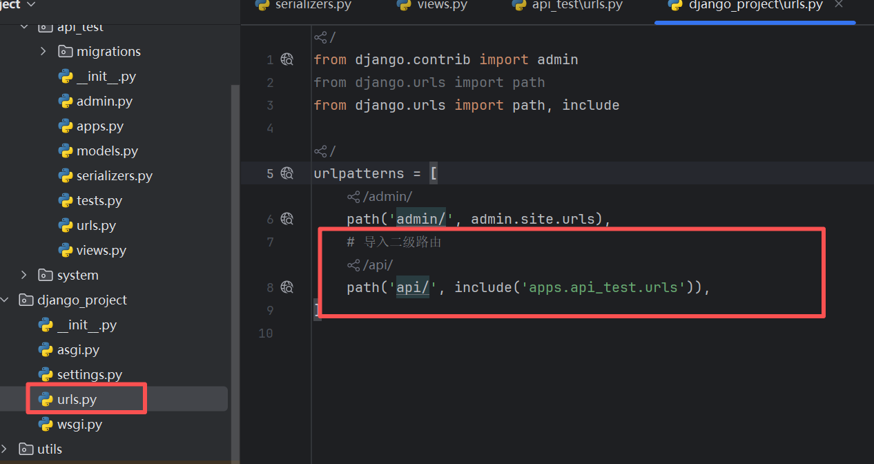 因此,我们再总路由中,添加相关的配置。autotp_django/urls.py总路由配置中,添加: