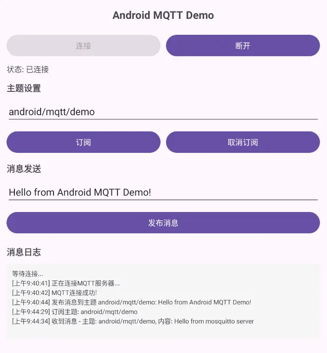 }override fun messageArrived(topic: String?, message: MqttMessage?) { val payload = String(message?.payload ?: ByteArray(0)) Log.d(TAG, "收到消息 - 主题: $topic, 内容: $payload") mCallback?.onMessageReceived(topic ?: "", payload) } override fun deliveryComplete(token: IMqttDeliveryToken?) { val topics = token?.topics if (topics != null && topics.isNotEmpty()) { val topic = topics[0] Log.d(TAG, "消息投递完成 - 主题: $topic") mCallback?.onMessageDelivered(topic) } }})