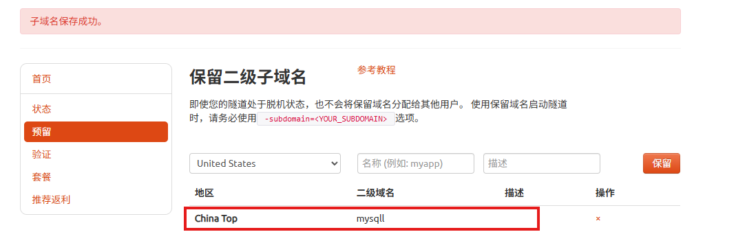 点击左侧的预留,选择保留二级子域名,地区选择china Top,然后设置一个二级子域名名称,我这里演示使用的是mysqll,大家可以自定义。填写备注信息,点击保留。
