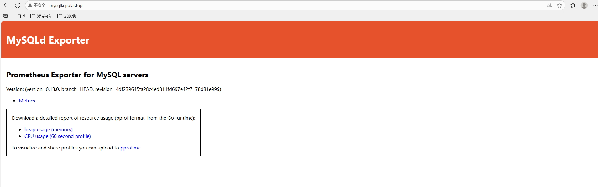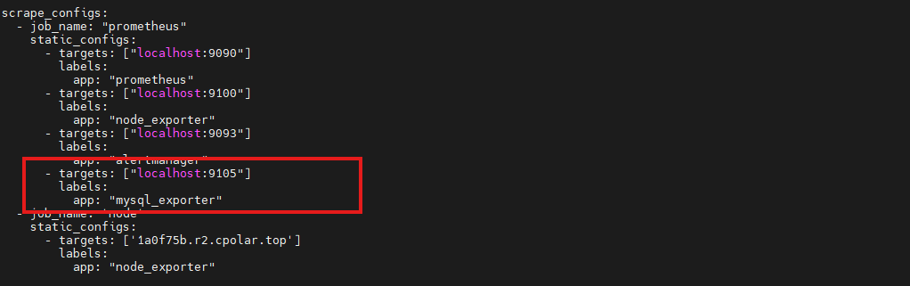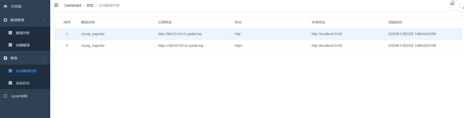 Prometheus可以通过这个公网地址38c53143.r2.cpolar.top访问到运行在本地9105端口的mysql_exporter服务,从而抓取系统指标。