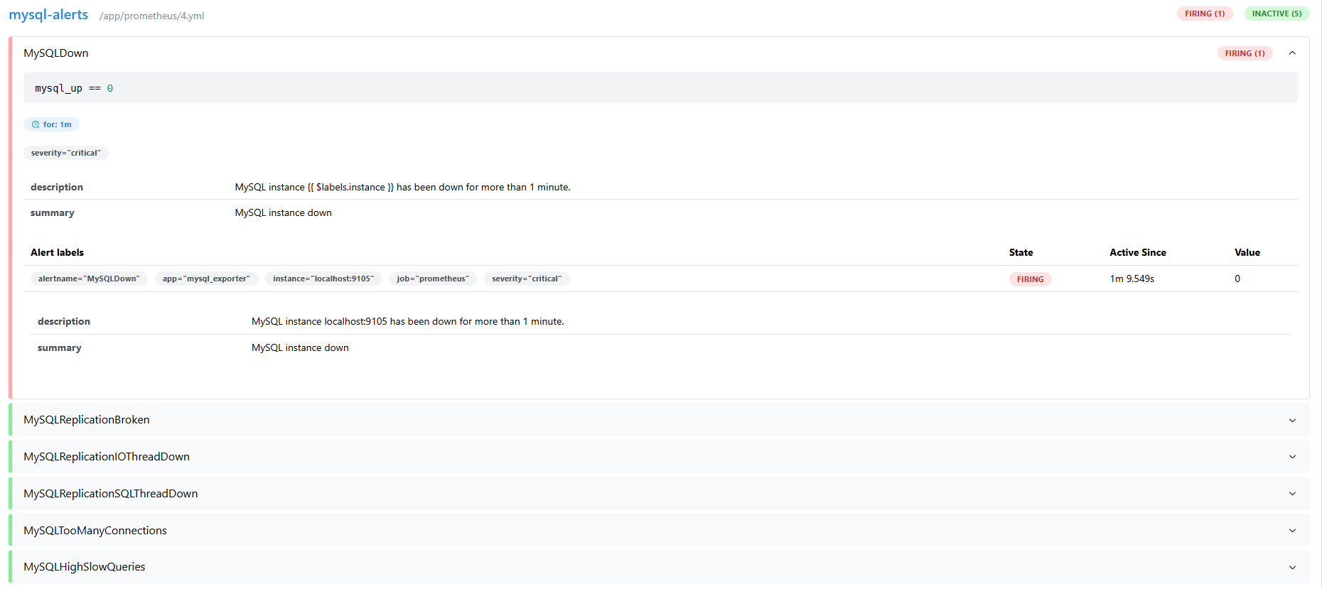 description: "MySQL instance {{ $labels.instance }} has been down for more than 1 minute."