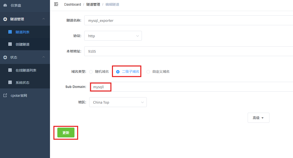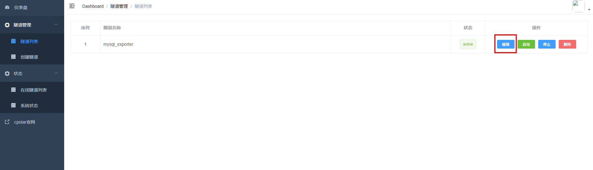 登录cpolar web UI管理界面,点击左侧仪表盘的隧道管理------隧道列表,找到所要配置的隧道mysql_exporter,点击右侧的编辑。