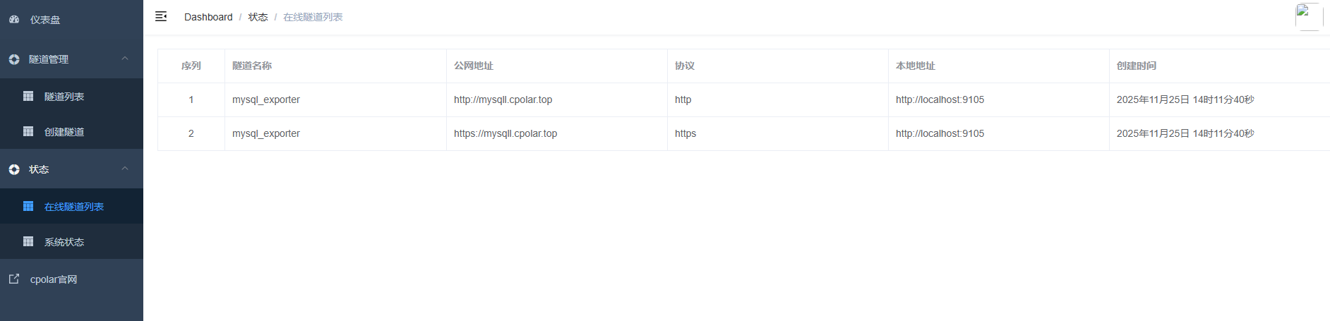 mysql_exporter 是 MySQL 监控的 "黄金搭档",能把数据库的 "健康状况" 摸得透透的,而 cpolar 则是打破局域网限制的 "穿墙术",两者结合,就像给数据库监控装了 "千里眼"------ 不管 MySQL 藏在哪个角落的局域网里,你都能随时随地掌握它的运行状态,提前发现问题、解决问题,再也不用被 "内网限制" 捆住手脚。对于中小企业、个人开发者、运维人员来说,这套组合既省钱又好用,不用花大价钱买云监控平台,就能搭建一套专业、稳定的 MySQL 远程监控体系,性价比直接拉满。
