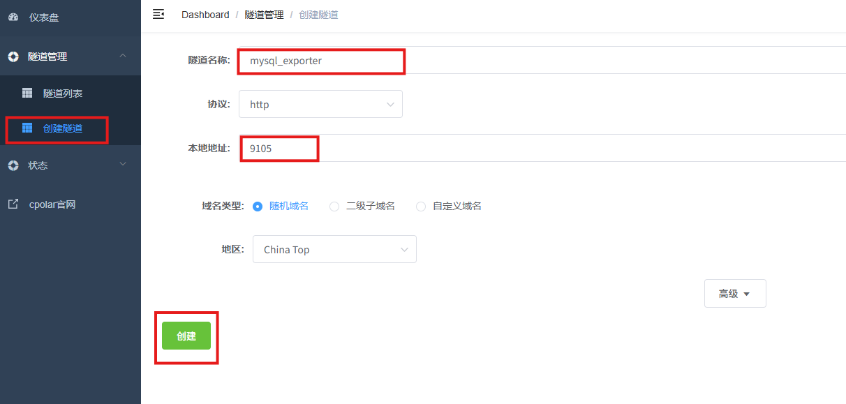 隧道名称:可自定义,本例使用了:mysql_exporter,注意不要与已有的隧道名称重复