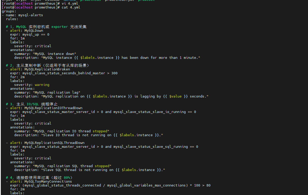 expr: rate(mysql_global_status_slow_queries[5m]) > 0.1 # ≈ 每分钟 > 6 条