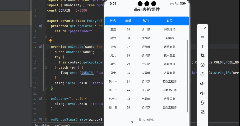 适配「序号列」的场景,在表格左侧添加序号列,方便用户查看数据条数,只需添加序号列配置,无需改动核心逻辑,一行代码实现,鸿蒙端完美适配: