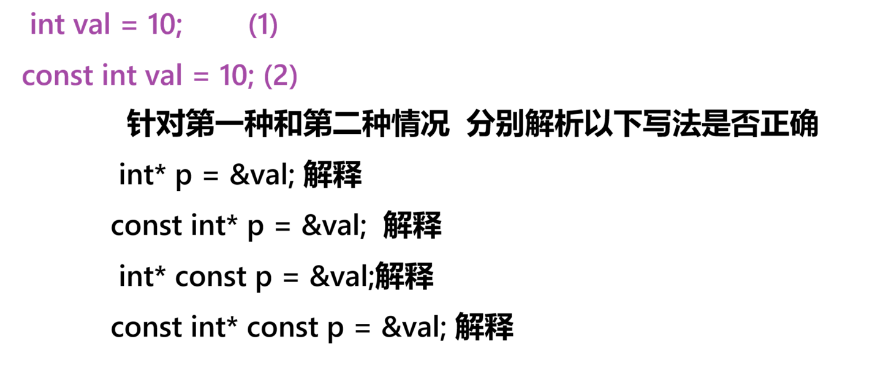 int*const p=&val;const修饰p说明p具有常性 p=&a是错误的,p的指向不允许被修改