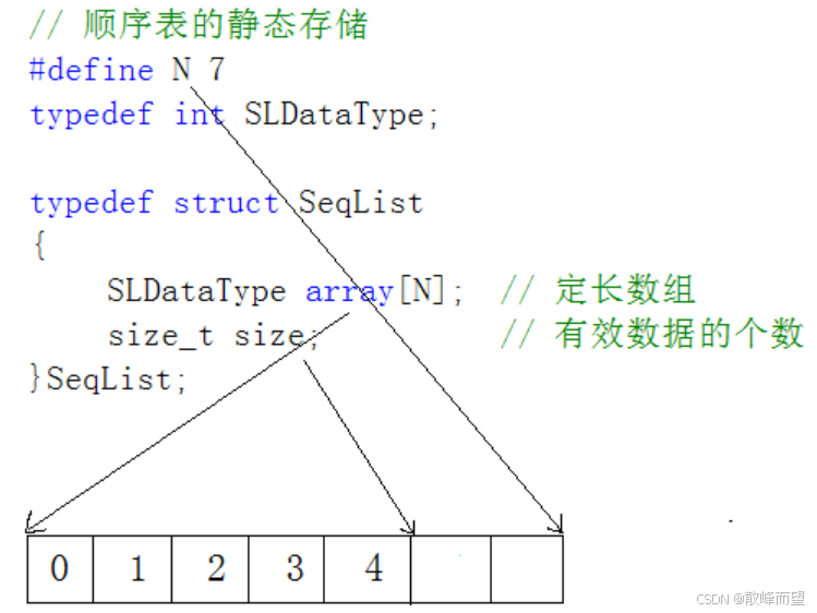 - 静态顺序表:使用定长数组存储元素。