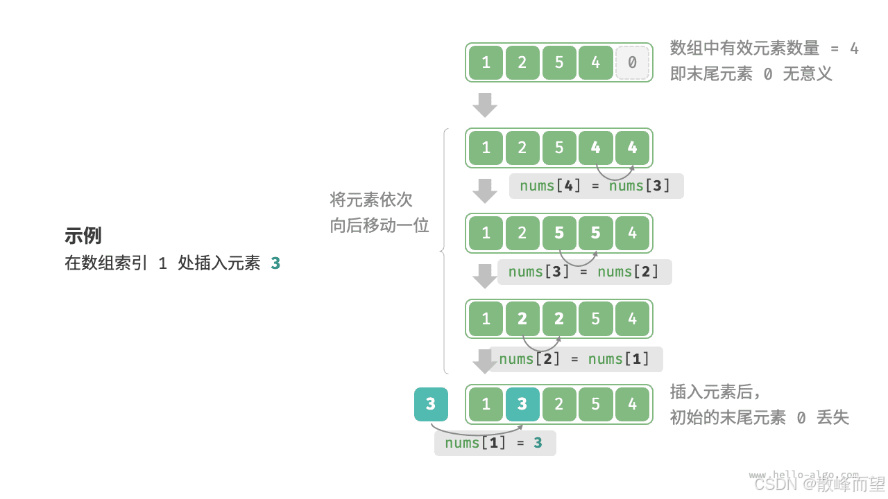 - 插入与删除效率低:当数组中元素较多时,插入与删除操作需要移动大量的元素。