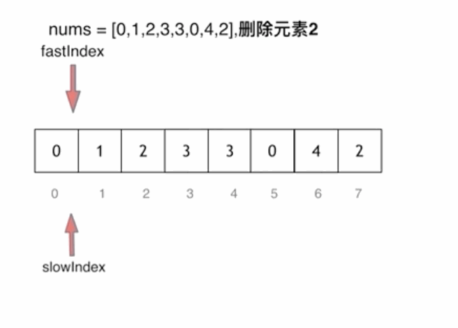 - 快指针:寻找新数组的元素 ,新数组就是不含有目标元素的数组
