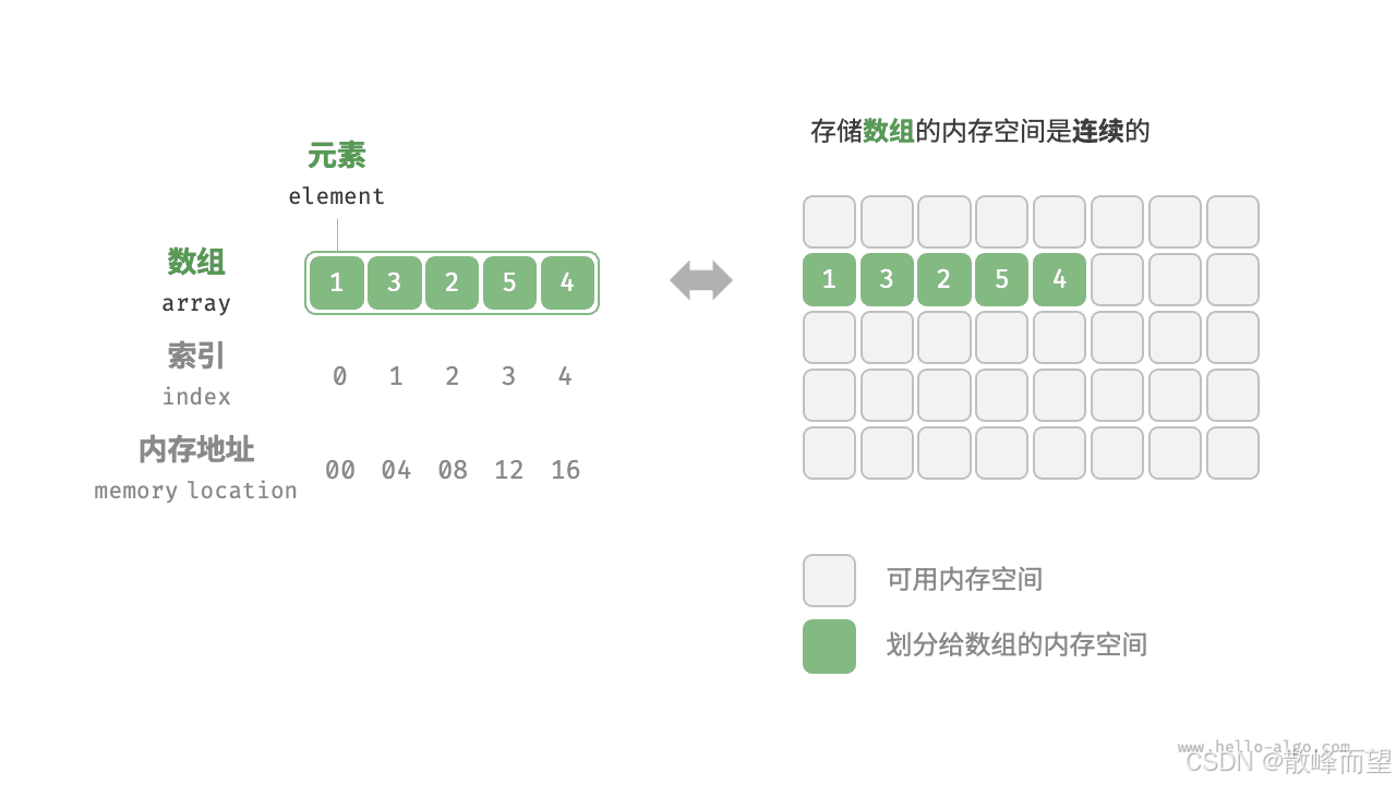 数组存储在连续的内存空间内,且元素类型相同。这种做法包含丰富的先验信息,系统可以利用这些信息来优化数据结构的操作效率。