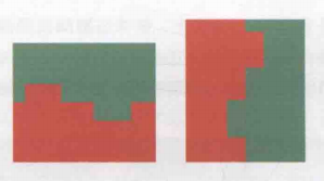 基于图像的因素之一是,视野中较低的区域更有可能被感知为图形。这个想法在若干年后由Shaun Vecera及其同事(Vecera,Vogel和Woodman,2002)证实。在实验中,他们给被试呈现150毫秒如图7所示的刺激,需要被试判断哪个区域更有可能会被视为图形(红色或绿色)。结果显示,对于上下结构的刺激,被试更倾向于将下部区域感知为图形。但对于左右结构的刺激,他们对左边区域仅表现出了很小的偏好。因此研究者认为,在确定图形时并不存在左右偏好,但存在上下偏好。这与我们每天感知到的典型场景相符。在我们的日常经验中,"图形"更有可能位于水平线的下方,而天空为背景。