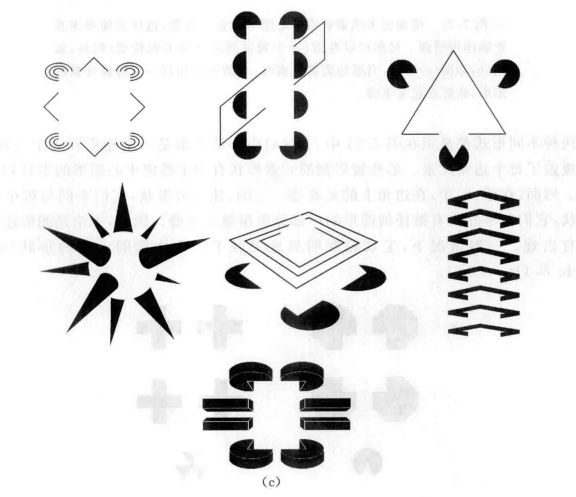 (i)表面重叠,表面重叠是解释主观轮廓的一个原则。当一个"图案"对更多其他的图案造成覆盖时,该图案越容易被知觉为一个整体。如图4(i)和图3,周围的线索的增加对三角形的感知;