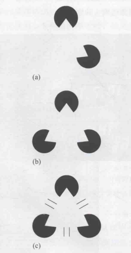 该理论很直观,但也它的有缺点,它无法解释下面两种现象。第一种是似动,它表示多个位置或形状不同的闪光相继快速出现,使人产生连续变化的运动错觉。视频实际上就是利用这种原理,它由一张张图片相继出现形成,而非画像"在动"。图2显示的是似动的一个例子,首先一个亮点闪现,然后黑屏,然后另一个亮点闪现,当黑屏的时间足够短时(少于1秒),两个点就会形成运动的错觉。按照构造主义的说法,运动知觉应该需要对真实运动进行感知,但是似动并无真实运动产生。另一个无法解释的现象是主观轮廓。主观轮廓指,仅根据图像的一些线索,能在图像空白区域产生边缘或轮廓的错觉。如图3,对比图(a)和图(b),图(b)更容易知觉到是一个三角形,就好像三条边是真实存在的一样,如果加一些辅助线(图(c))这种知觉则更加明显。但这里并无真实的边存在,按照构造主义的说法应该无法形成三角形的知觉。