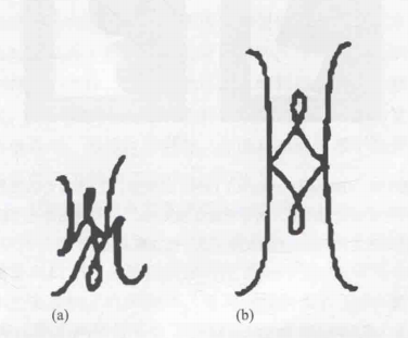 关于经验对图形-背景分割的作用,不同学者有不同的观点。一些知觉格式塔心理学家认为,图形-背景分割可能会受到经验的影响,但内置原则可以覆盖经验的作用。即过去的经验和刺激的意义在知觉组织中起着很小的作用。如图9(a),大多数人认为图为"W"位于"M"的上方,这在很大程度上是基于过去的经验。然而,当呈现的是图9(b)时,大多数人看到是两条竖线及它们之间的图案。这种由良好连续性原则产生的竖线成为了主导性知觉,覆盖了过去对W和M的经验所产生的影响(Wertheimer,1912)。因此,这些格式塔心理学家主张,图形必须从背景中脱颖而出后才能得到识别。换言之,在我们给图形赋予意义之前,它必须先与背景分割开来。过去的经验和刺激的意义在知觉组织中作用不大。
