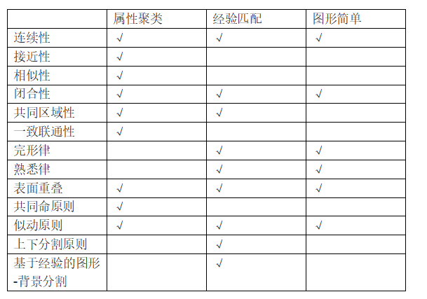以上描述了一些格式塔原则,实际上,这些原则并非孤立存在,而是相互之间存在一定的重合。例如,闭合性和完形律,它们的组织方式均旨在使图形显得更为简洁和熟悉。我认为,这些原则可以抽象为更为普遍的准则。为了与上述具体原则相区分,我将这些抽象出的准则称为"一般原则",而将之前所述的格式塔原则称为"具体原则"。经过归纳总结,一般原则主要包括:属性聚类、经验匹配和简单图形。