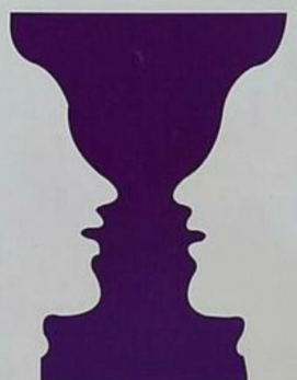 格式塔心理学家研究图形和背景属性的一种方法是考察如图所示的图案,因为它可以在两种知觉结果间变换,既可以被视为一个灰色的背景下彼此注视的两张深蓝色面孔,又可以被视为深蓝色背景下的一个灰色花瓶。一些图形和背景的属性如下:
