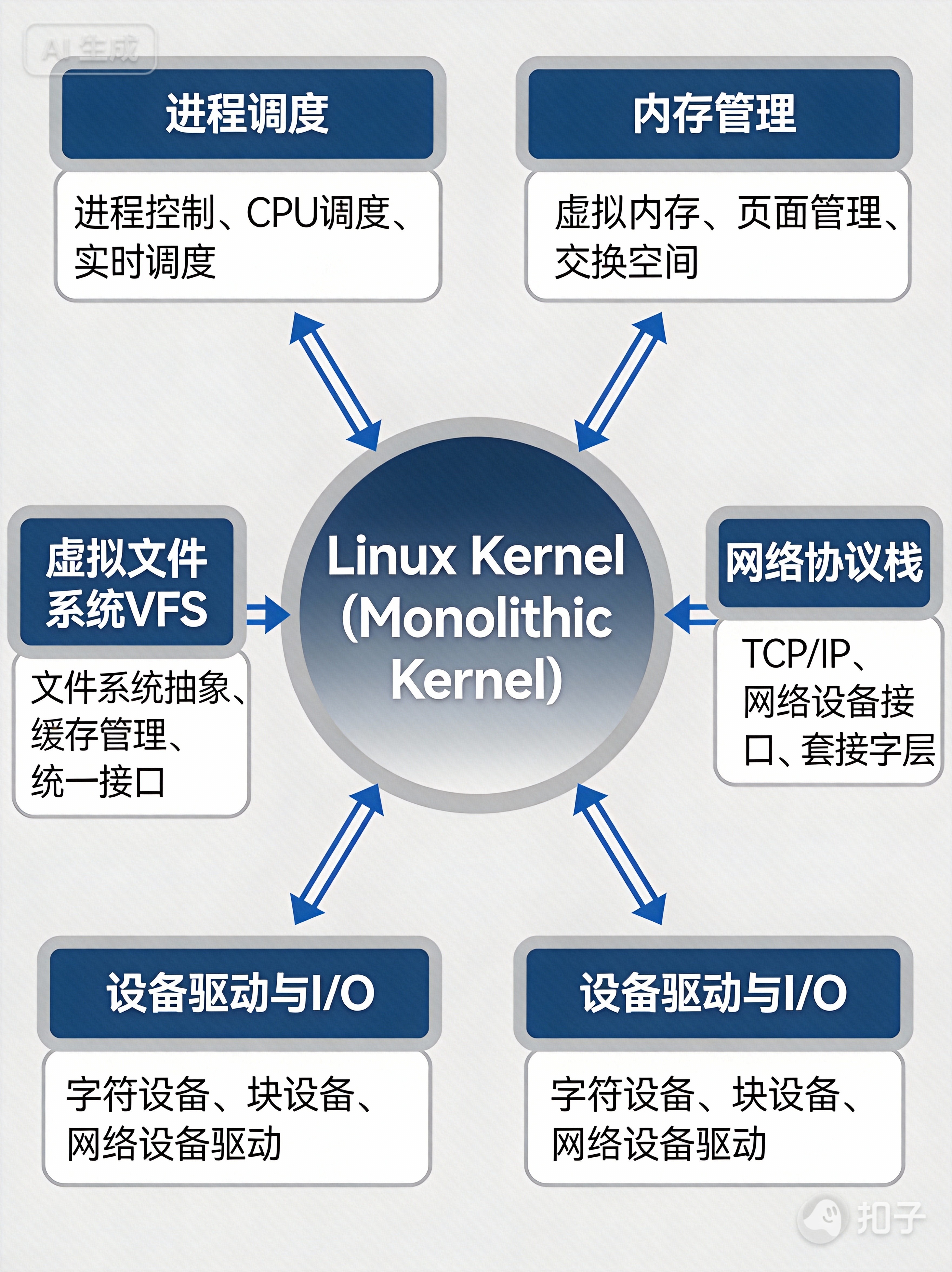 Linux 内核是一个宏内核(monolithic kernel),功能高度集成。尽管模块众多,但核心可归纳为 五大基础子系统,它们共同支撑整个操作系统运行: