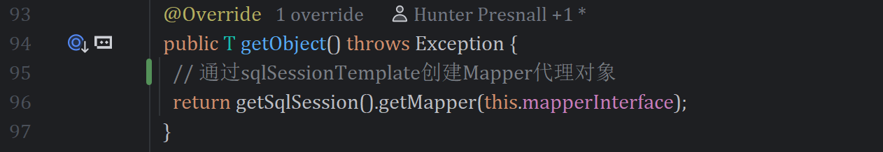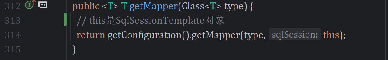 很显然,MapperFactoryBean实现了FactoryBean接口,getObject方法会创建Mapper代理对象(单例的),此对象持有的SqlSession其实是sqlSessionTemplate实例。