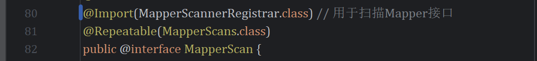在mybatis-spring.jar中,提供了@MapperScan注解,从而引入@Import(MapperScannerRegistrar.class) 。