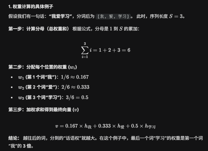 结论: 直接取最后一个词就像是只听演讲者的总结陈词;而加权平均则是听取整场演讲,但给总结陈词更高的权重。显然,后者得到的理解会更全面。