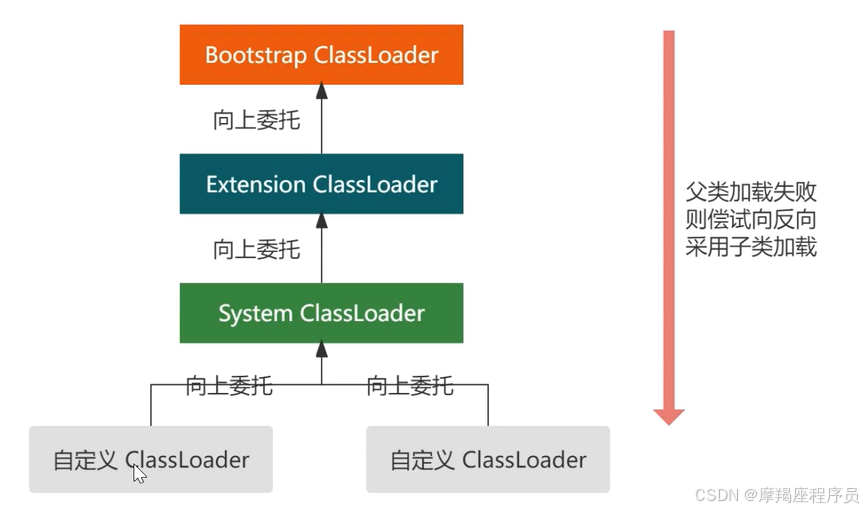 (3)如果父类加载器,可以完成加载,则因为加载完成,否则,则反向采用子类依次加载,直到成功;
